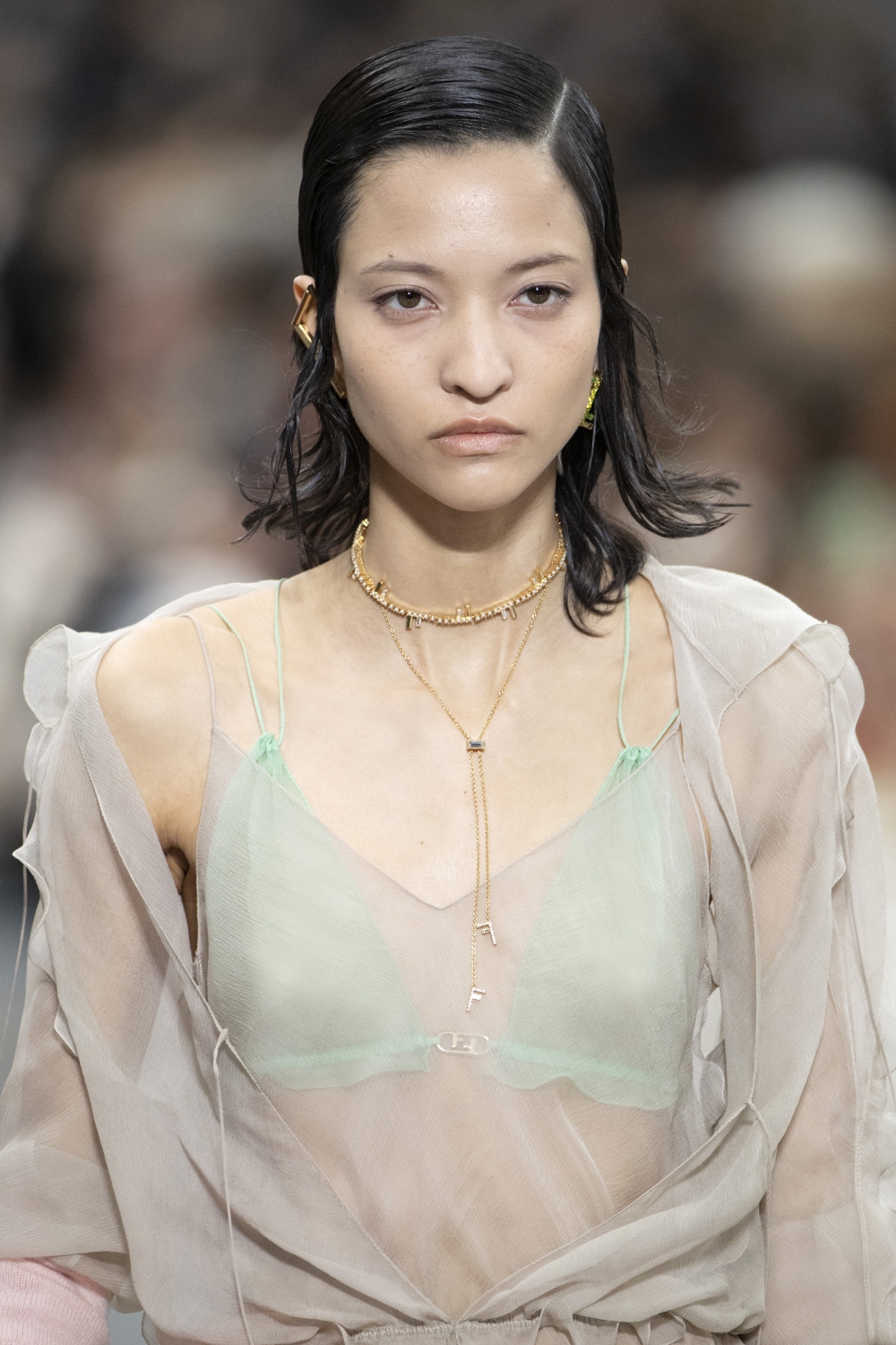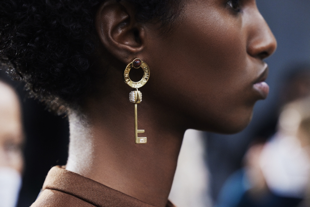 細看模特兒身上的珠寶配飾,珠寶藝術總監Delfina Delettrez將字母標誌放大,設計出奪目的耳夾;鑲石手鍊則嵌入長方形水晶,模仿FF標誌的造型。系列亦推出全新的Master Key圖案,成為項鍊吊墜或耳環垂飾。無論是創意還是精緻程度,再次讓人驚艷彰顯的女性氣質。