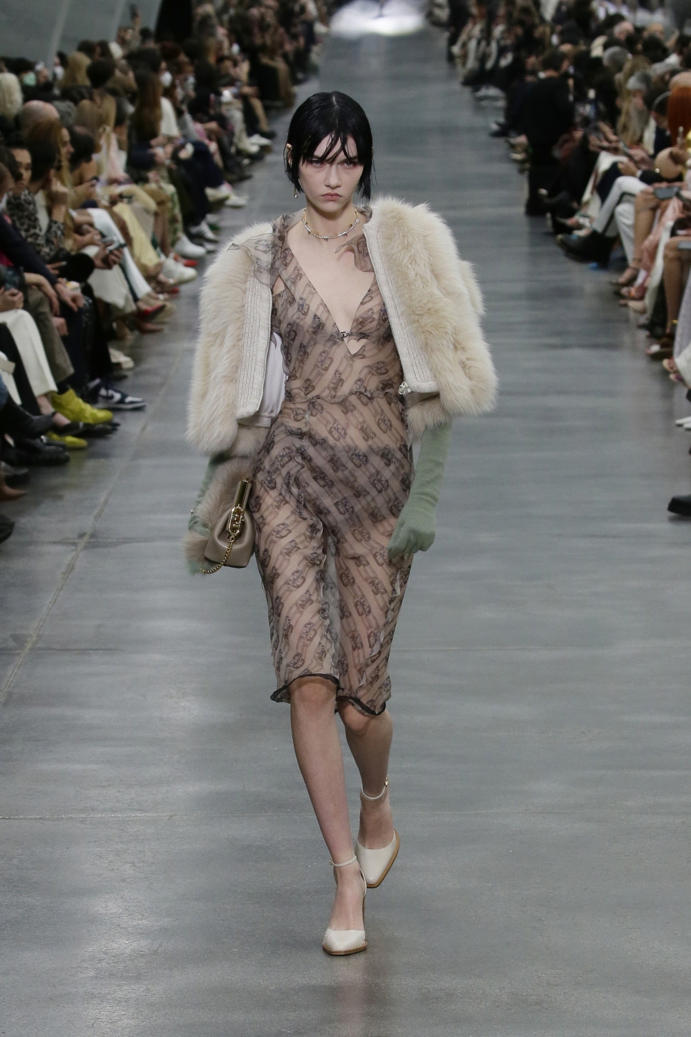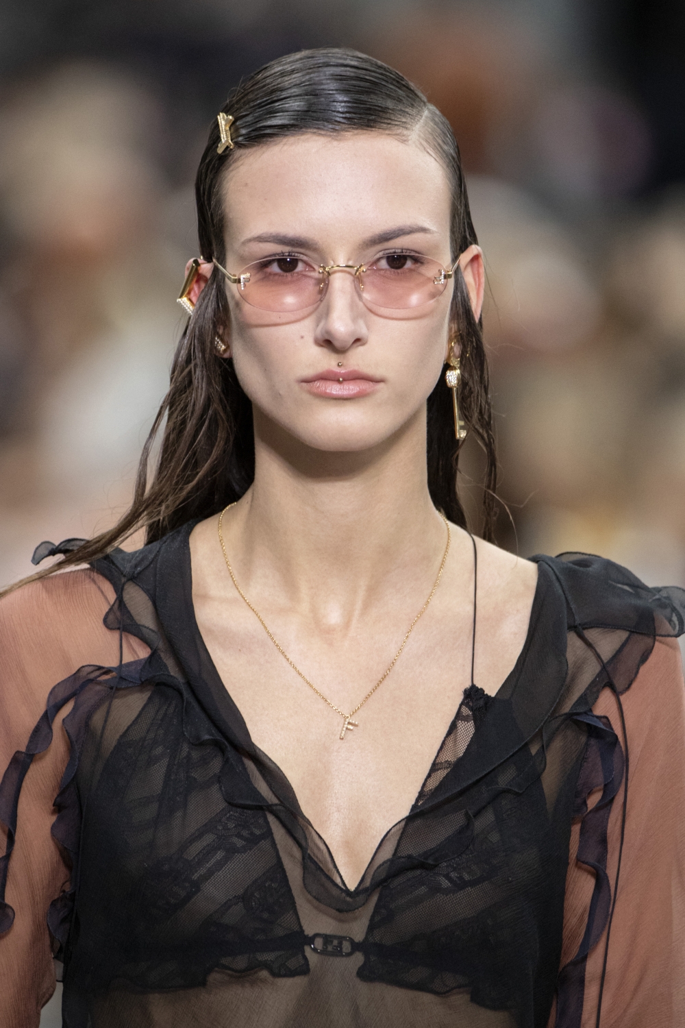 FENDI 2022秋冬大秀在於義大利米蘭的Via Solari 總部舉行,女裝創意總監Kim Jones帶領大家回到過去,從FENDI家族的衣櫥中回溯品牌的兩大經典,透過時尚的手法重新演繹昔日的風格,為品牌經典換上全新面貌。似乎Kim Jones也沉醉於Y2K風潮,模特兒一頭濕髮造型、髮夾、太陽眼鏡千禧風格,Z 世代最喜歡的名模Bella Hadid帶領展開序幕。