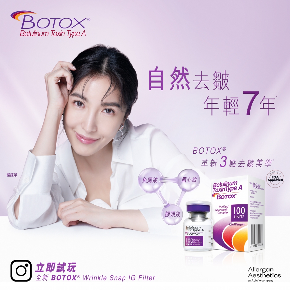 BOTOX®保妥適®藥品註冊編號:HK-41906. BOTOX®為醫生處方藥物,請向醫生或醫學美容中心諮詢切合您獨特需要的專屬療程方案。療程效果因人而異。療程後如有任何不良反應,請即向醫生查詢 © 2022 Allergan Aesthetics. All right reserved. HK-BCT-220086. Approval Date: 15/Nov/2022. All adverse events should be reported to drugsafety.pv@abbvie.com
