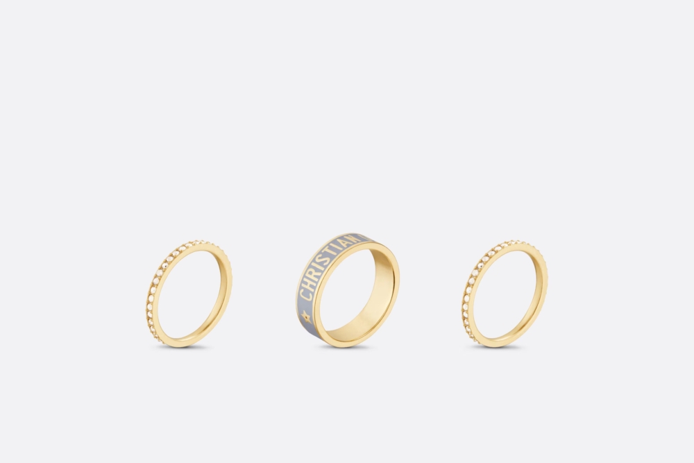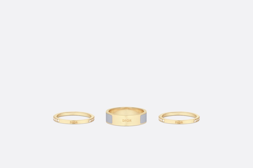 Dior Code戒指套裝設計時尚而經典,兩枚纖幼的金色飾面金屬戒指鋪鑲上白色水晶,第三枚戒指則綴以淡雅灰色釉漆呈現較圓潤的造型,綴以Christian Dior標誌,別具時尚風格。若是不想佩戴一系列,挑選一枚也能展現獨樹一幟風格。HK$4,800