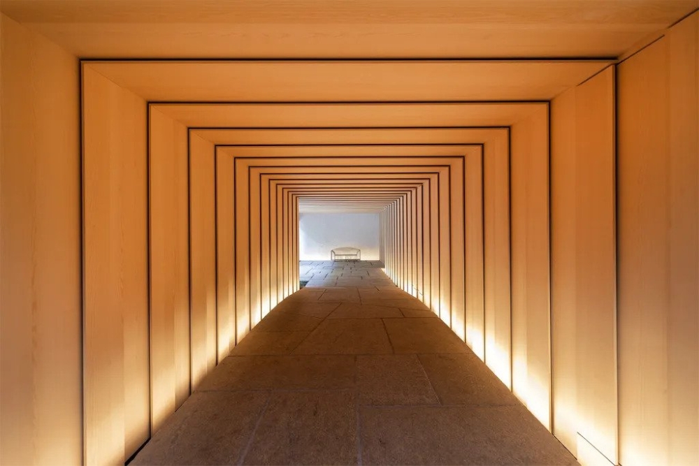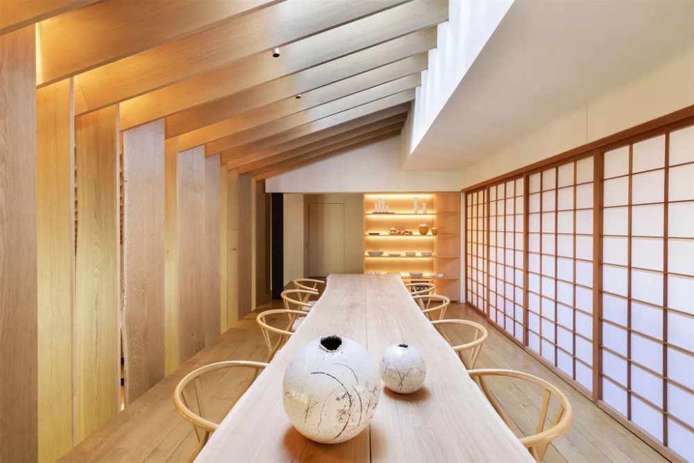 以水池取替傳統日本和室外的走廊,其櫻桃樹和楓樹、竹子、杜松、苔蘚、岩石和瀑布等充滿日式的元素,展現日本的寧靜與平和氣息,創造了內部和外部之間的無縫連接。透明是日本建築的一個特點,Kengo Kuma談到建築哲學時說:「我嘗試使用輕質和天然材料來展現一種新的透明度。」