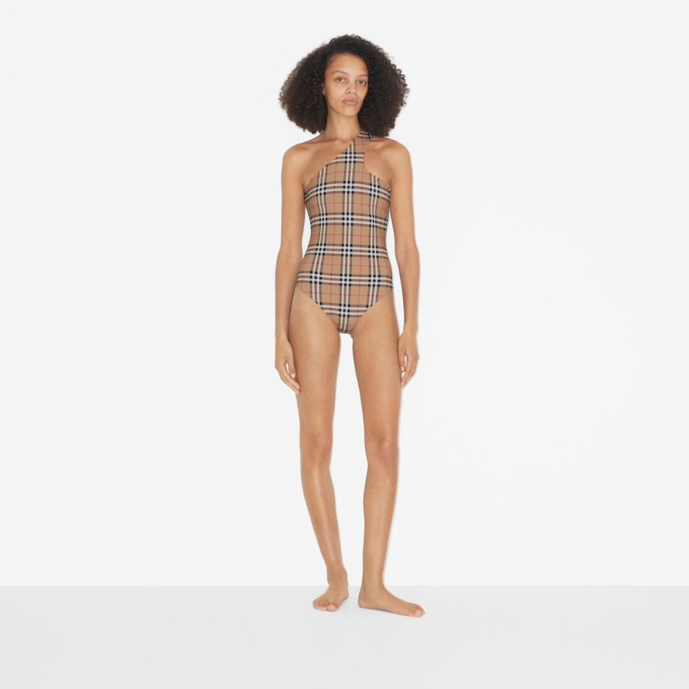 繞頸式比基尼,選用彈力尼龍面料打造,裝飾 Burberry 格紋。搭配可拆式胸墊,