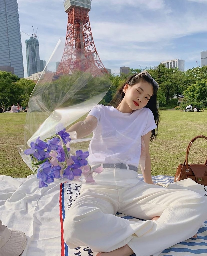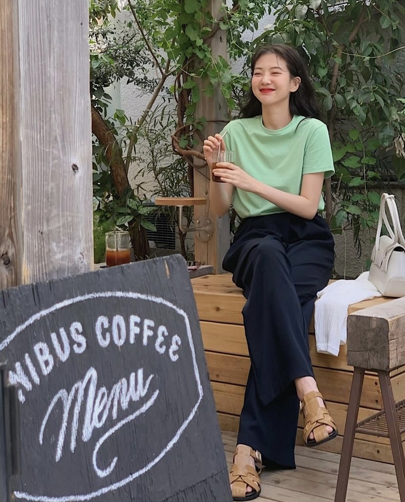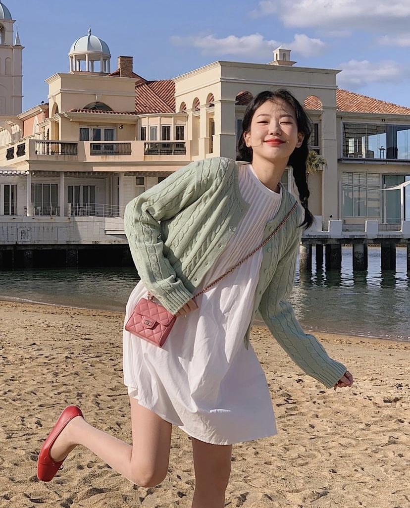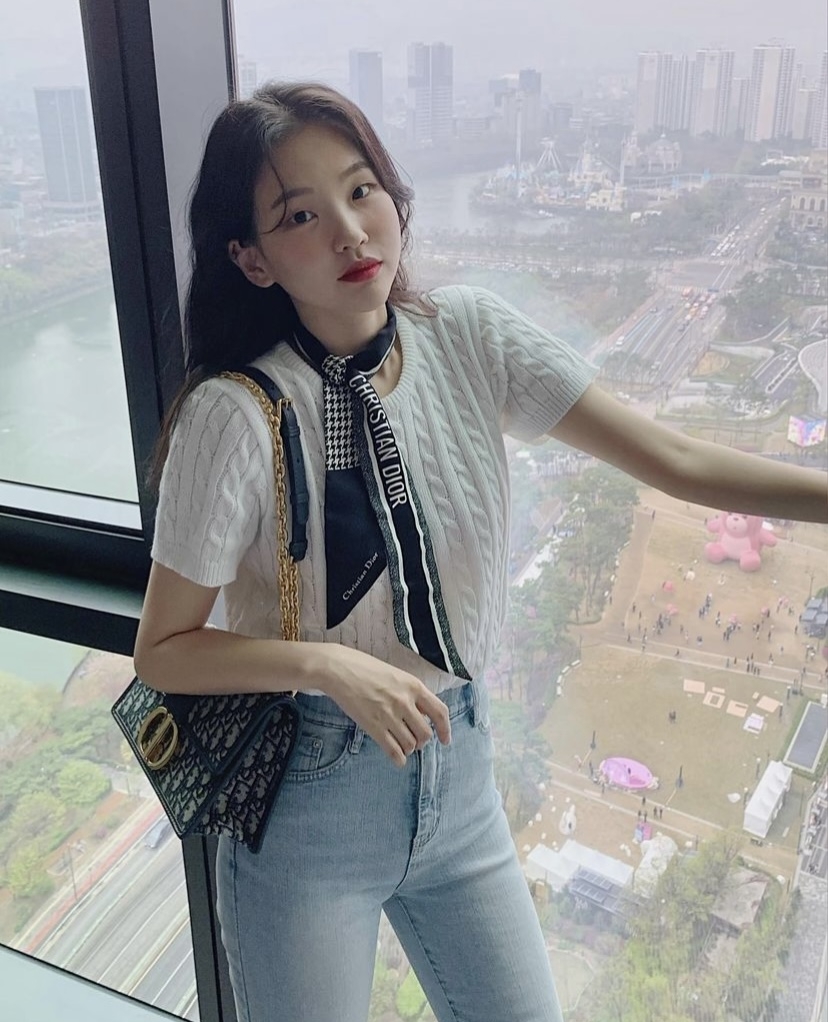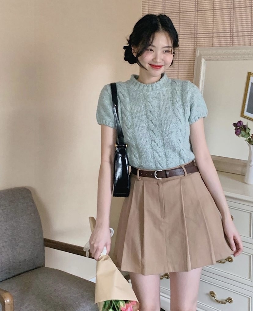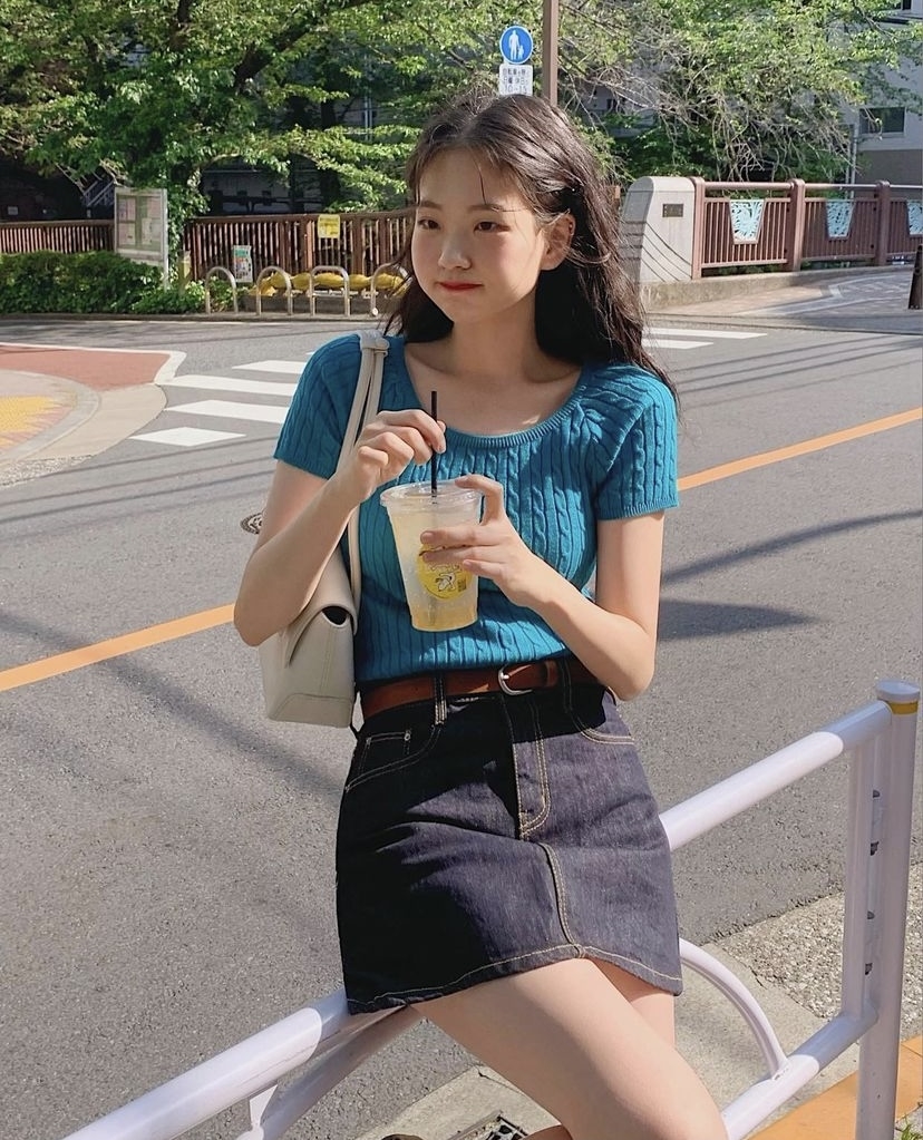除了短版針織外套,短袖針織在春夏也是重點單品,如乾淨純潔的白色、療癒舒爽的藍色,套在kimehwa白皙膚色的身上,下半身挑選微微的A字剪裁讓版型不過於合身的短裙,繫上皮帶顯腰身,日常約會相當合適。當然,不只裙子,一件簡單的牛仔長褲更是輕鬆完裝。