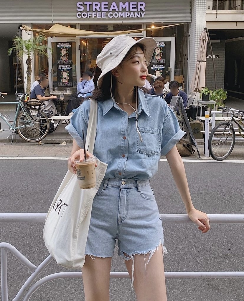 丹寧元素在夏天是很好展現清爽氛圍的單品,這位韓國模特兒挑選全身丹寧的襯衫與短褲,搭配在一起完美呈現率性的俏皮感。再搭配一頂漁夫帽,既有細節又充滿休閒,且身上的帆布揹袋也起了畫龍點睛效果,率性風中又注入幾分悠閒感,簡約又好看極了,不自覺也想路邊拿一杯咖啡街拍。