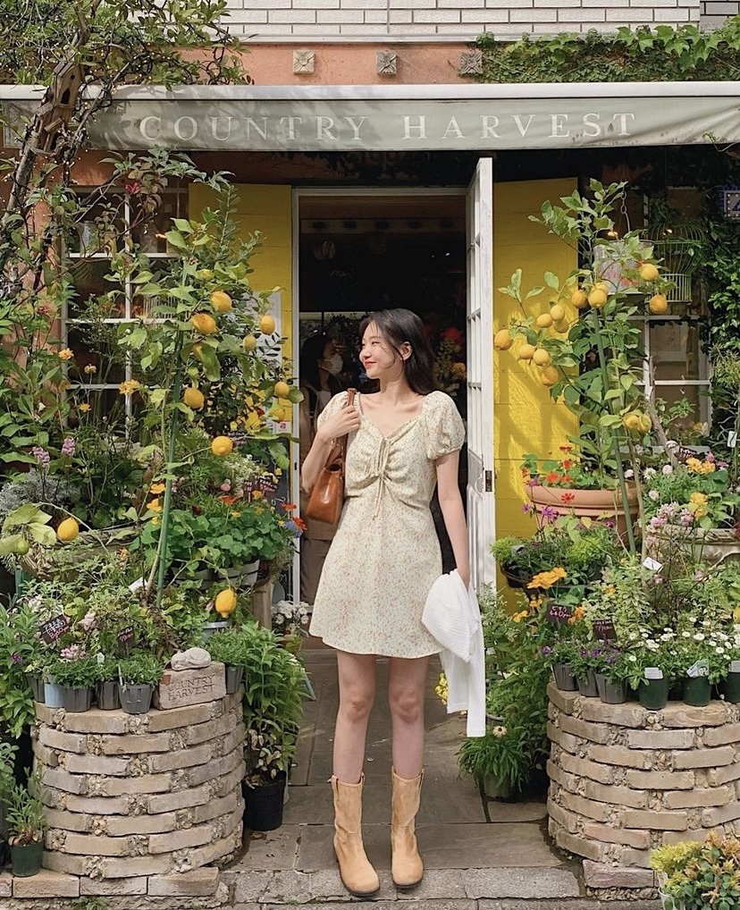溫柔婉約的迷人氣質,偶爾需要靠著打扮來增添魅力,像是小碎花洋裝,散發復古可愛的風格,搭配一雙靴子,能讓整體增添一絲型格感。kimehwa穿搭品味十分有特色,偶爾有優雅的率性,偶爾又能展現自然慵懶氛圍,舒服又時髦。