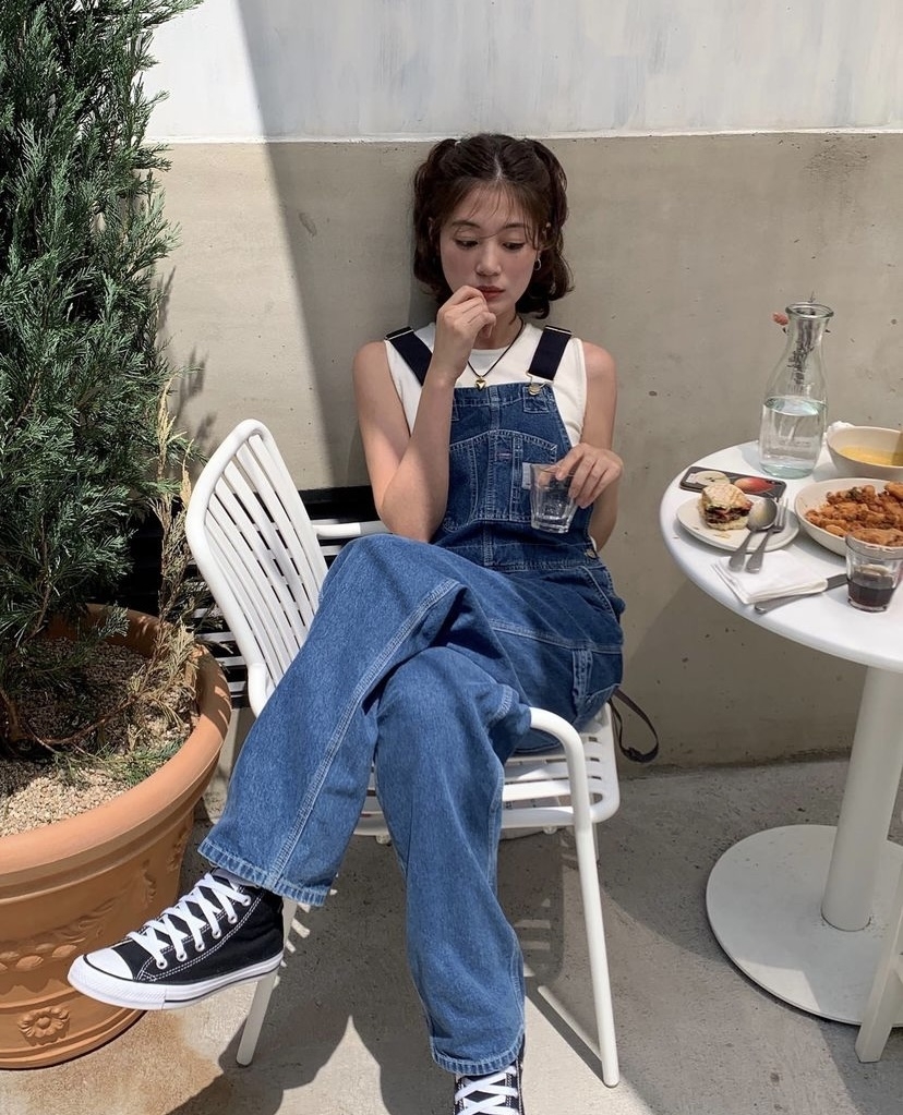 吊帶工裝褲,是一種較為率性的搭配,mookwa挑選牛仔材質的面料,搭配上簡約設計的白背心,中性風格帶點知性,加上一頭慵懶短捲髮,展露獨特的魅力。且隨性搭配一雙帆布鞋,帶點復古的休閒穿搭,綁著雙馬尾,在咖啡廳瞬間化身可愛又時髦的人。