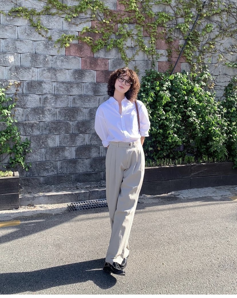 復古學院風對mookwa來說可以說是輕鬆駕馭的風格,尤其白色襯衫的搭配,隨性與牛仔褲結合一整套造型,休閒卻不失優雅感。mookwa把頭髮自然呈現蓬鬆的捲度,有一股時髦氣場,同時打扮的加持,在正式的襯衫單品加入輕鬆的元素,兼具了舒適與時尚,讓日常著裝也能成為上班的裝扮。