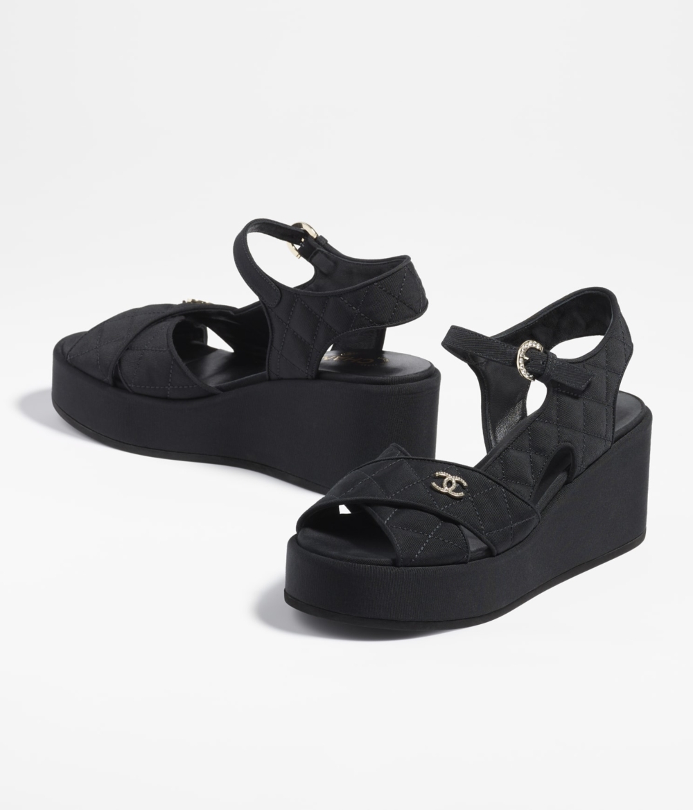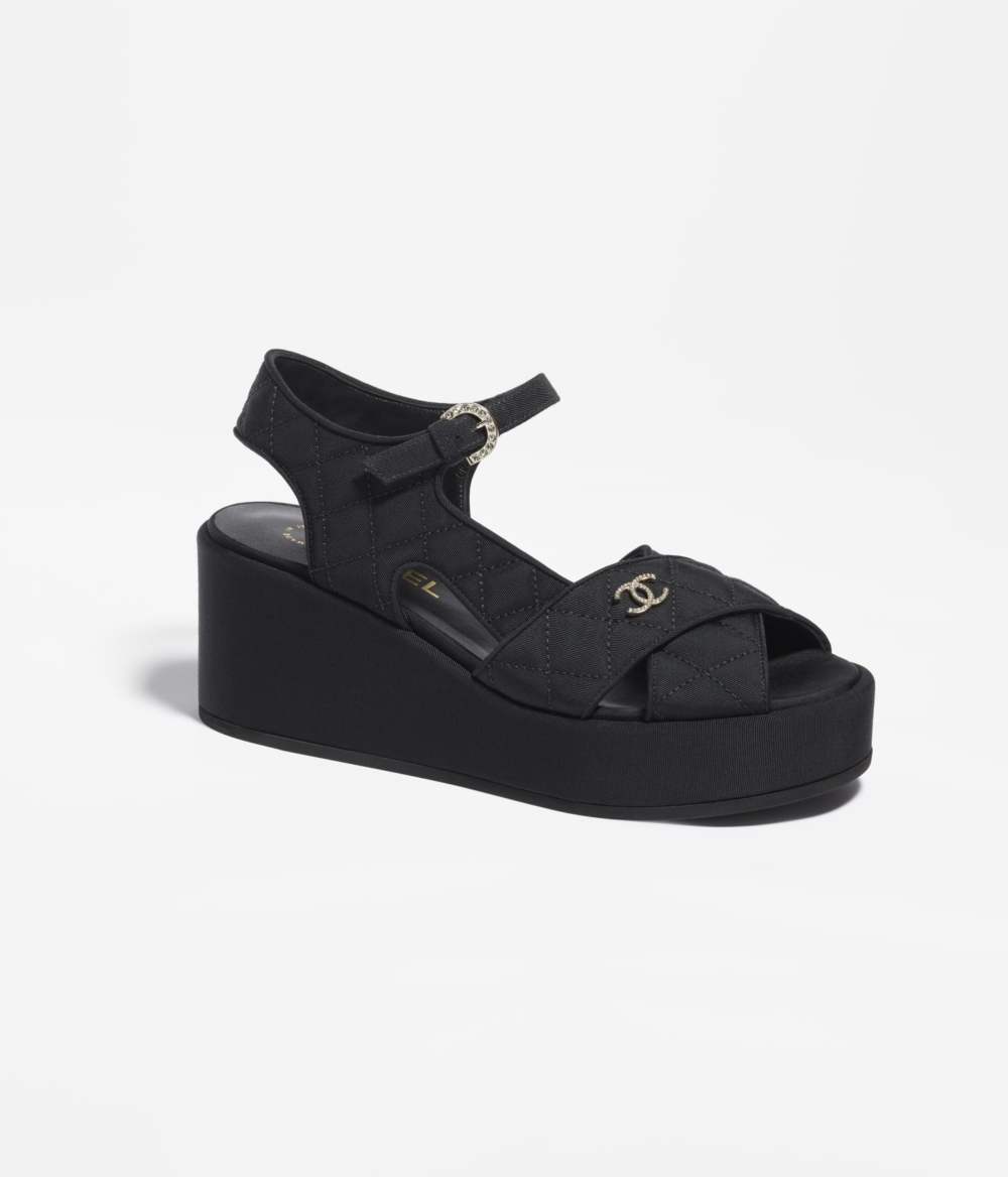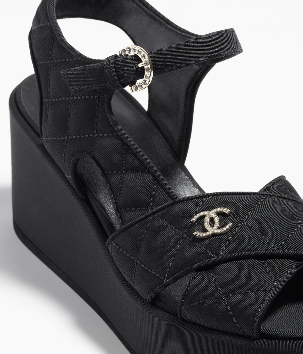 CHANEL這款厚底涼鞋採用黑色羅緞製成,表面光滑質感細膩的觸感,增添穿者的舒適度,搭配上帶有水鑽搭扣的鞋帶,並在鞋面上方以經典雙C元素以及優雅又夢幻的菱格紋,搭配上夏日短裙也相當適合。HK$10,600