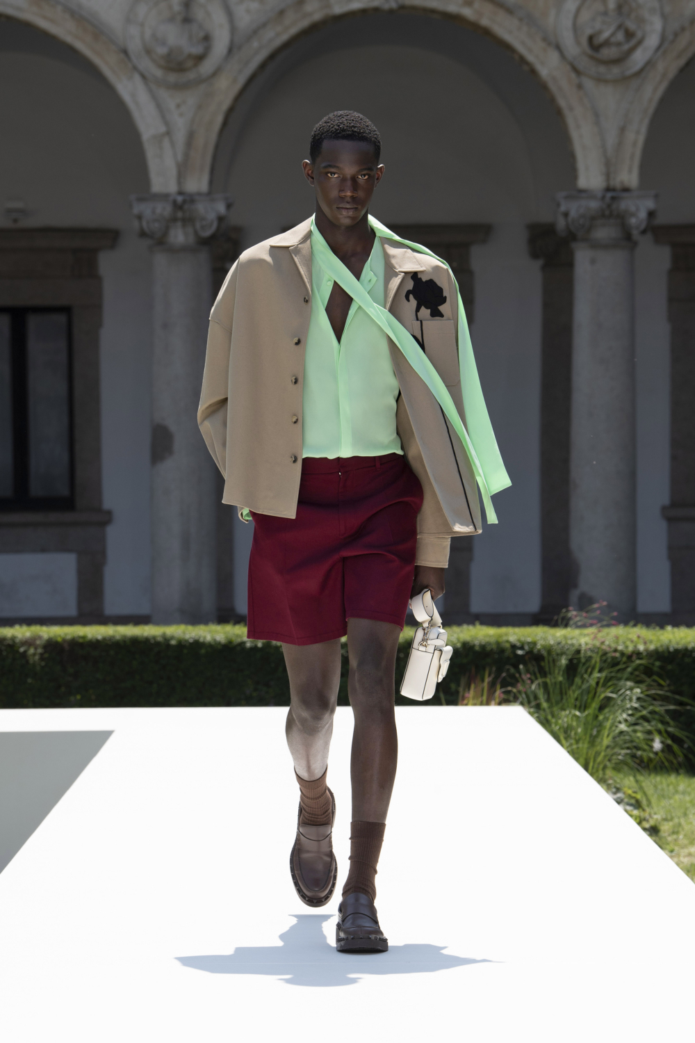 Pierpaolo Piccioli以全新角度審視男裝系列,譜寫新時代的男性氣質,版型硬挺,加上俐落剪裁,下身搭配短褲,從Valentino經典Valentino紅、Pink PP螢光粉,到藍與綠,煥發時髦活力的形象。