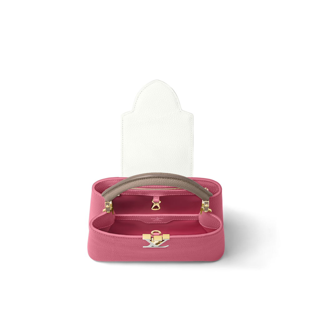 兩款Capucines Mini手袋以俏皮的設計以及鮮明的色彩吸引人,採用明亮的檸檬綠和粉色等流行色的搭配,並帶有白色的LV包身搭扣,非常適合用來搭配夏季造型。配有可拆卸撞色鏈條,最實用的包袋,斜背、側背、手拿一次滿足!檸檬綠€5,300(約