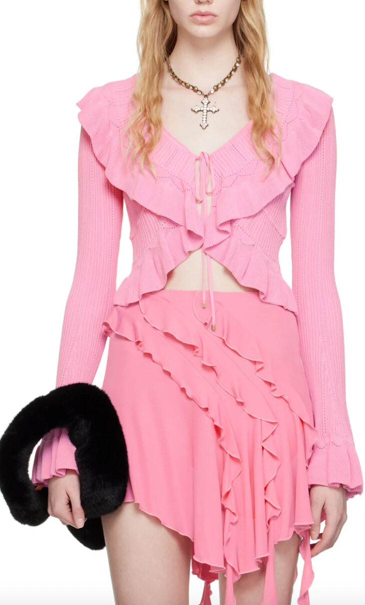 伴隨着Y2K熱潮的崛起,帶有濃濃千禧色彩的Blumarine正好迎合了時尚迷們的喜好,這款的粉色裙子以及上衣在邊緣處綴滿不規則的亮粉色荷葉邊飾邊,宛如蝴蝶翅膀的設計搭配綁帶收腰,以及鏤空設計,不但飄逸性感,而且可穿性高。