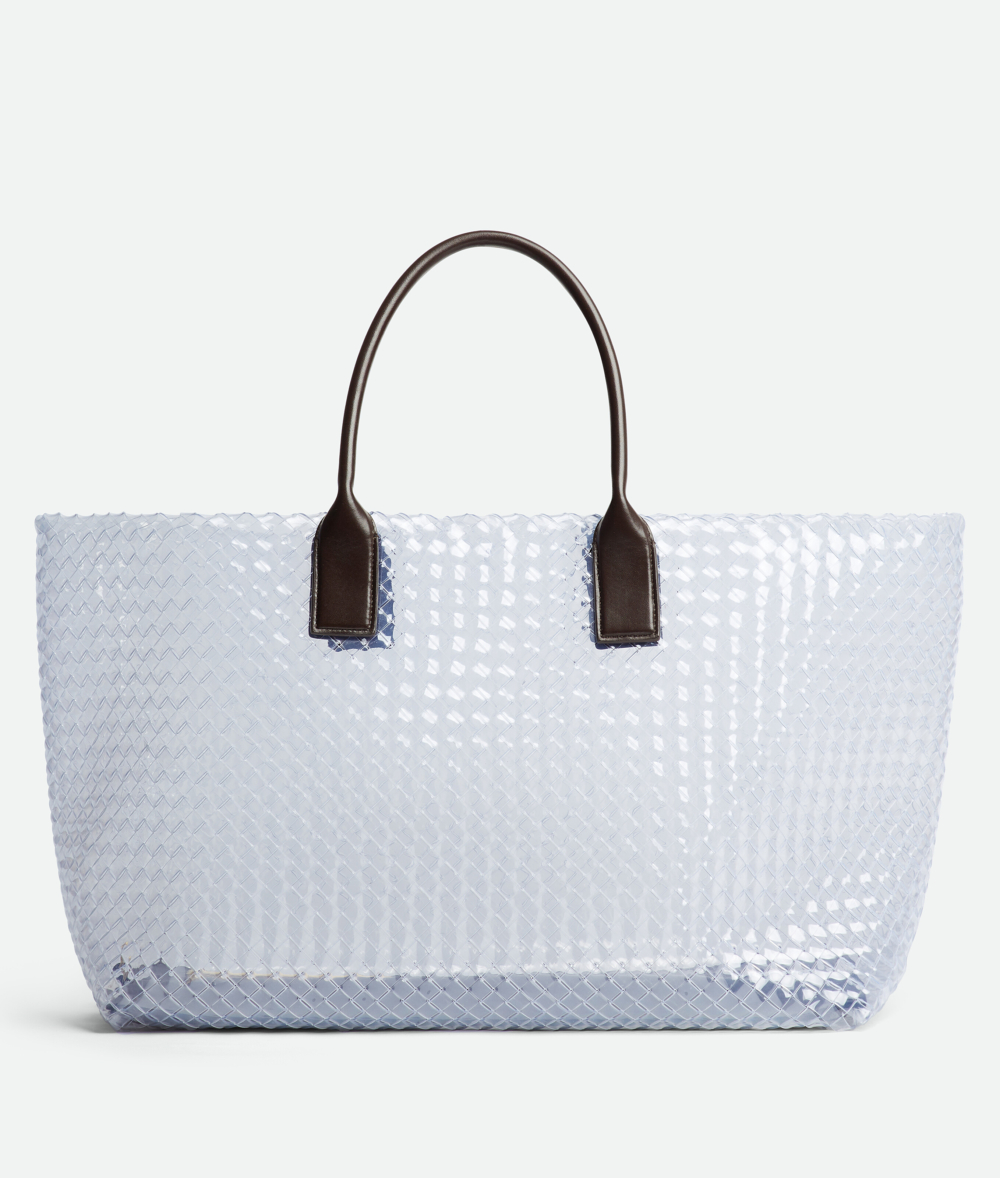Bottega Veneta的經典包款之一Cabat,是法語中的竹籃意思,本季全新Large Cabat Tote Bag,同樣採用編織元素,換上柔軟透明的矽膠材質,包身由義大利製造,精緻程度令人印象深刻。手袋配有可拆卸內部拉鍊口袋,搭配黑色小羊皮製成的手提把及底部。HK$79,000