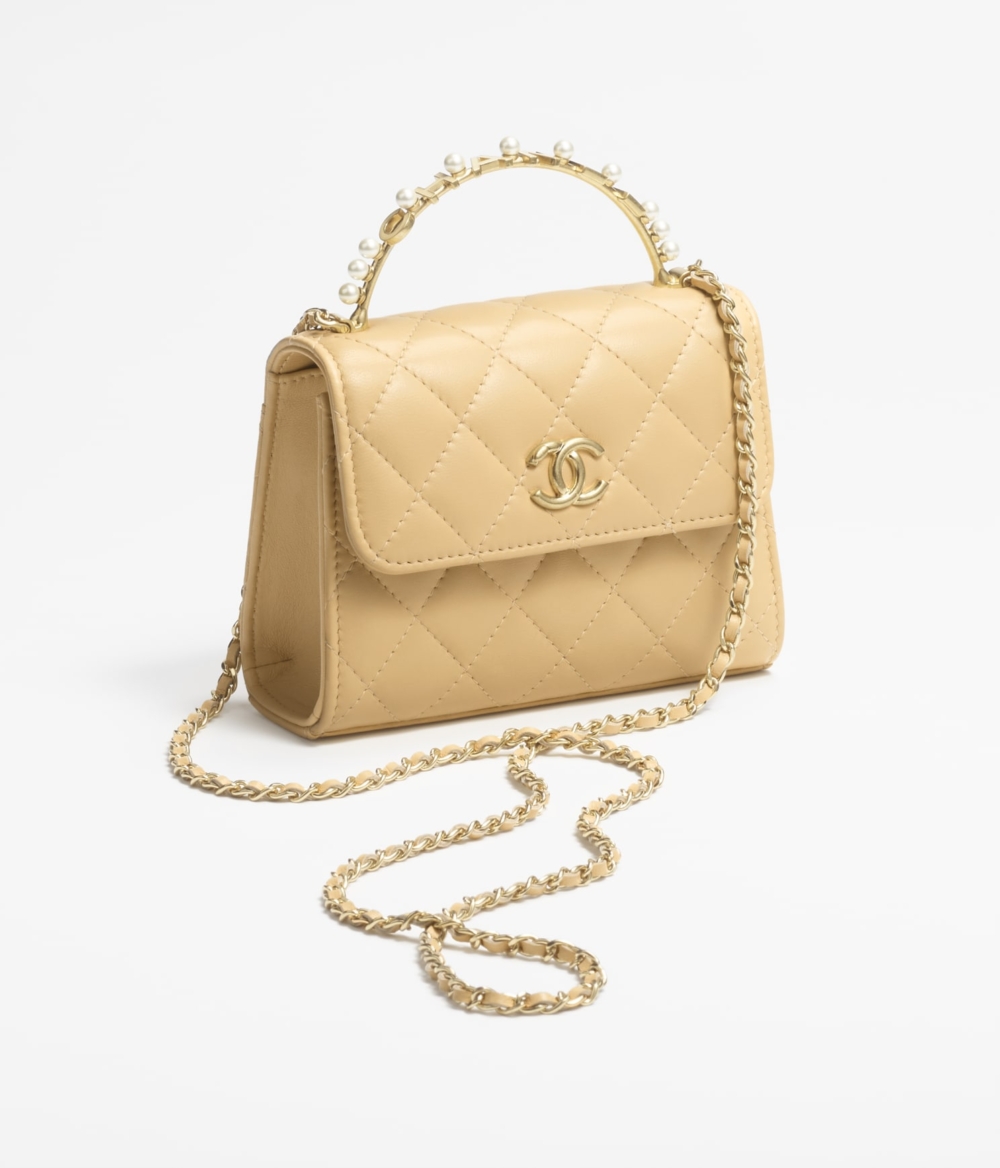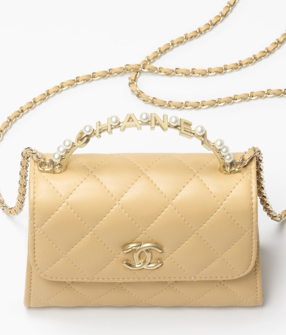 兩款以珍珠以及琺瑯CHANEL字樣裝飾手把的鍊帶包,無論是哪一款都能為造型增添無比迷人的氣息,粉色圓形款小袋以拉鍊開合,打開後附有圓形化妝鏡,外出時隨時補妝都方便。小巧的黃色小羊皮款,以雙C Logo做為磁扣開合,內部附上多個口袋,迷你小巧的尺寸作為臨時外出時的隨身小包相當合適。粉色HK$23,000,黃色HK$30,000