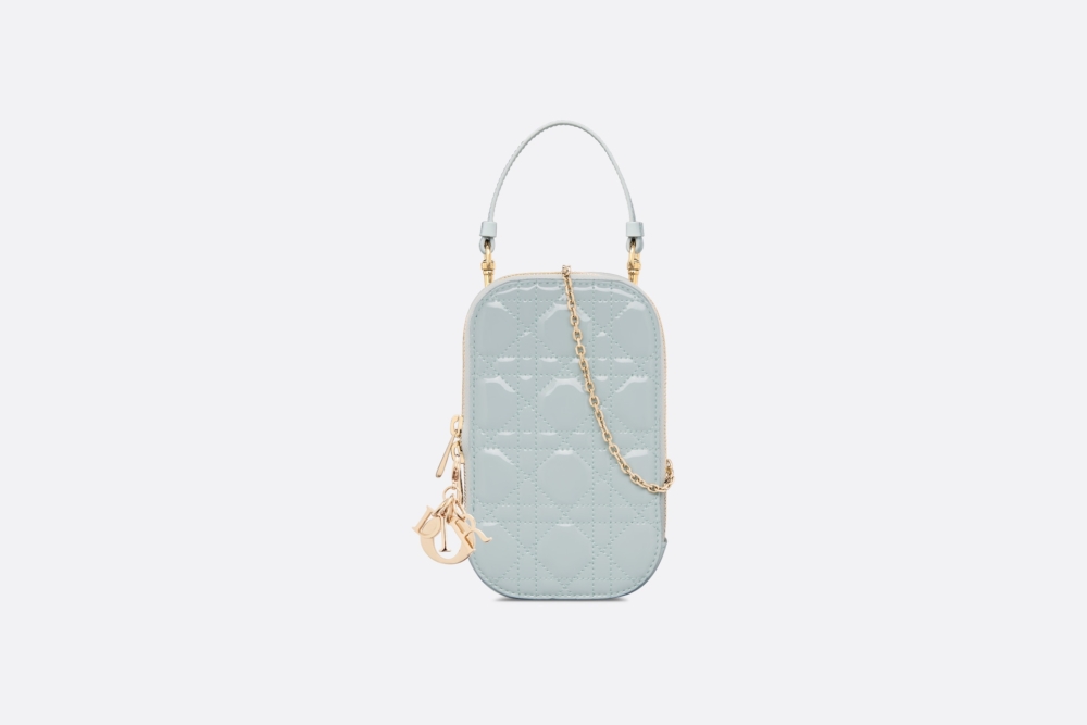Dior Lady Dior手機收納袋飾以粉藍色漆面Cannage藤格紋圖案小牛皮製成,亮面外觀帶來俏皮氛圍,配備手柄和鏈帶,雙向拉鏈開合,並附有3個卡片隔層,手袋外觀點綴可拆卸的 D.I.O.R.吊飾,不論場合與造型都時尚百搭。HK$11,000