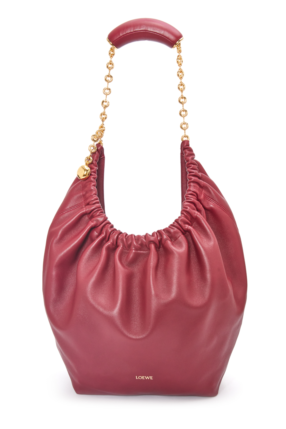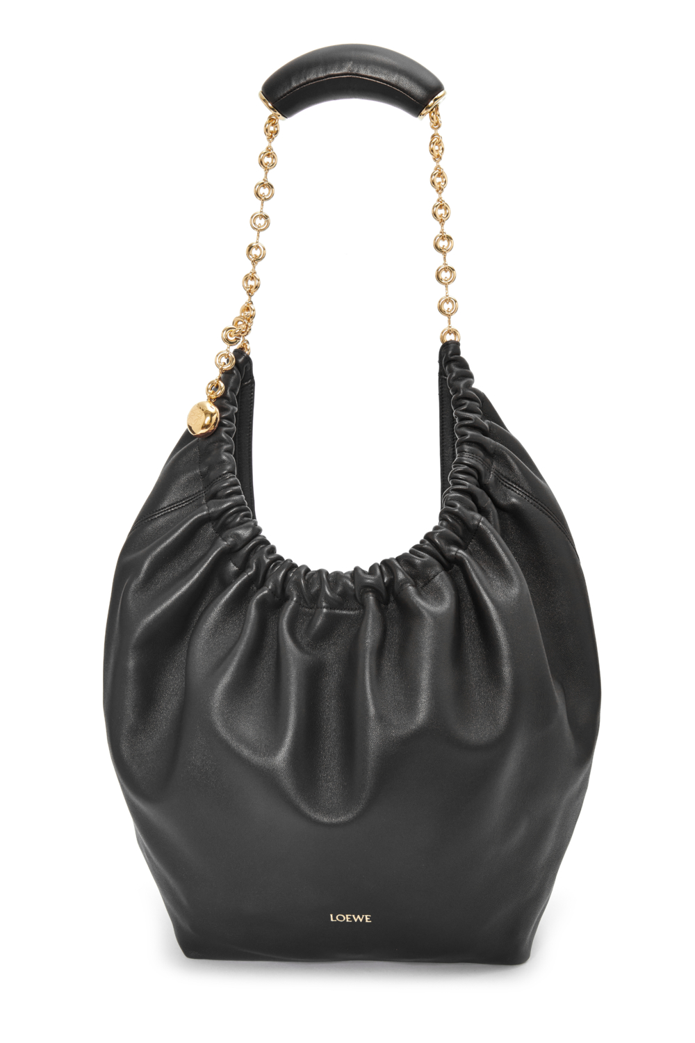LOEWE手袋「Squeeze」外觀採用略圓潤蓬鬆的Hobo縮口設計賦予其煥然一新的美感,推出中款以及小號兩種款式。金屬鍊帶採用童趣感十足的LOEWE甜甜圈金屬揹鏈,隱藏式的扣環、可拆卸的設計,還可以按照喜好加長金屬背帶,讓你可以自由變換多種背法,單肩背、斜背,或手提都方便,大大增加手袋的實用性!