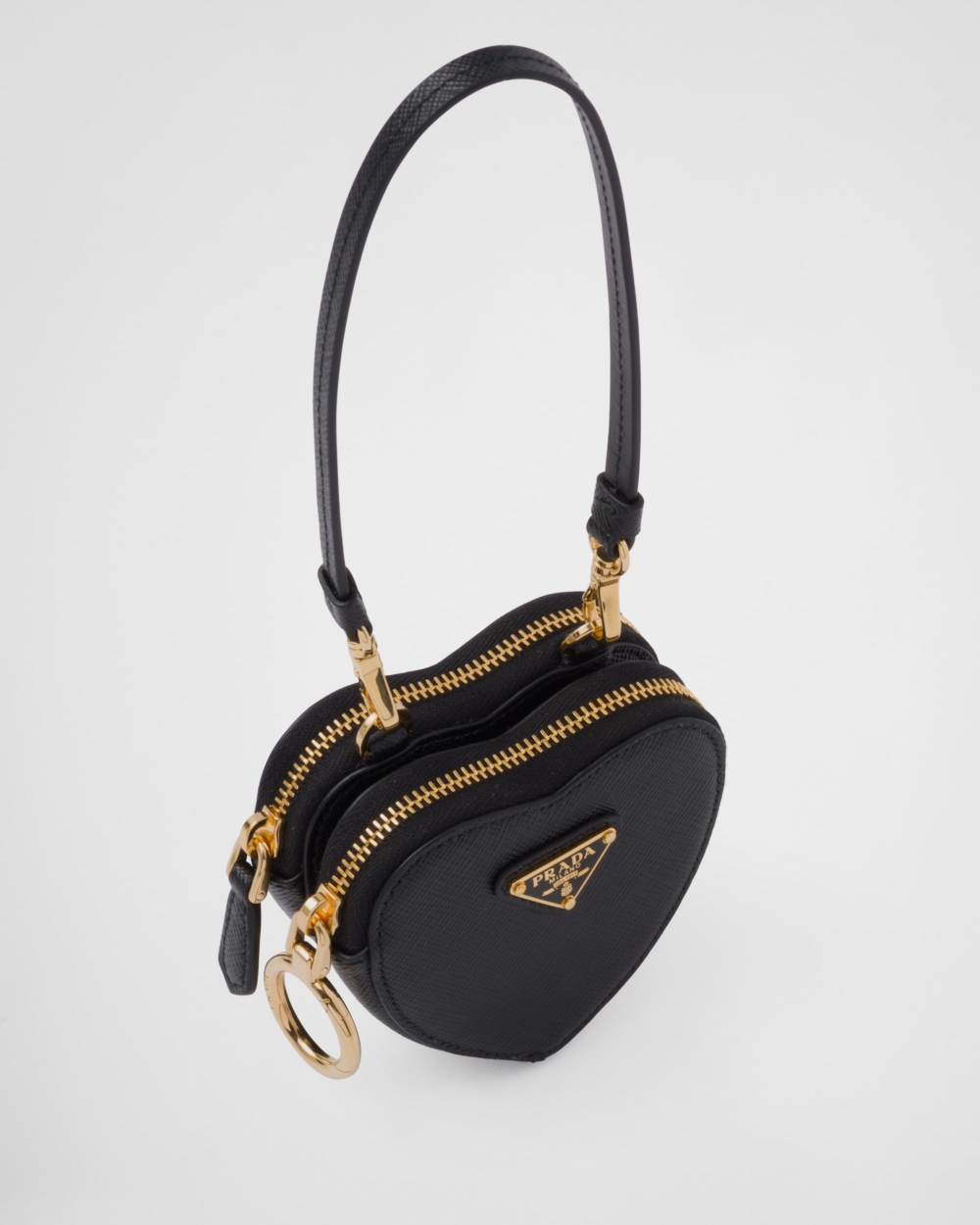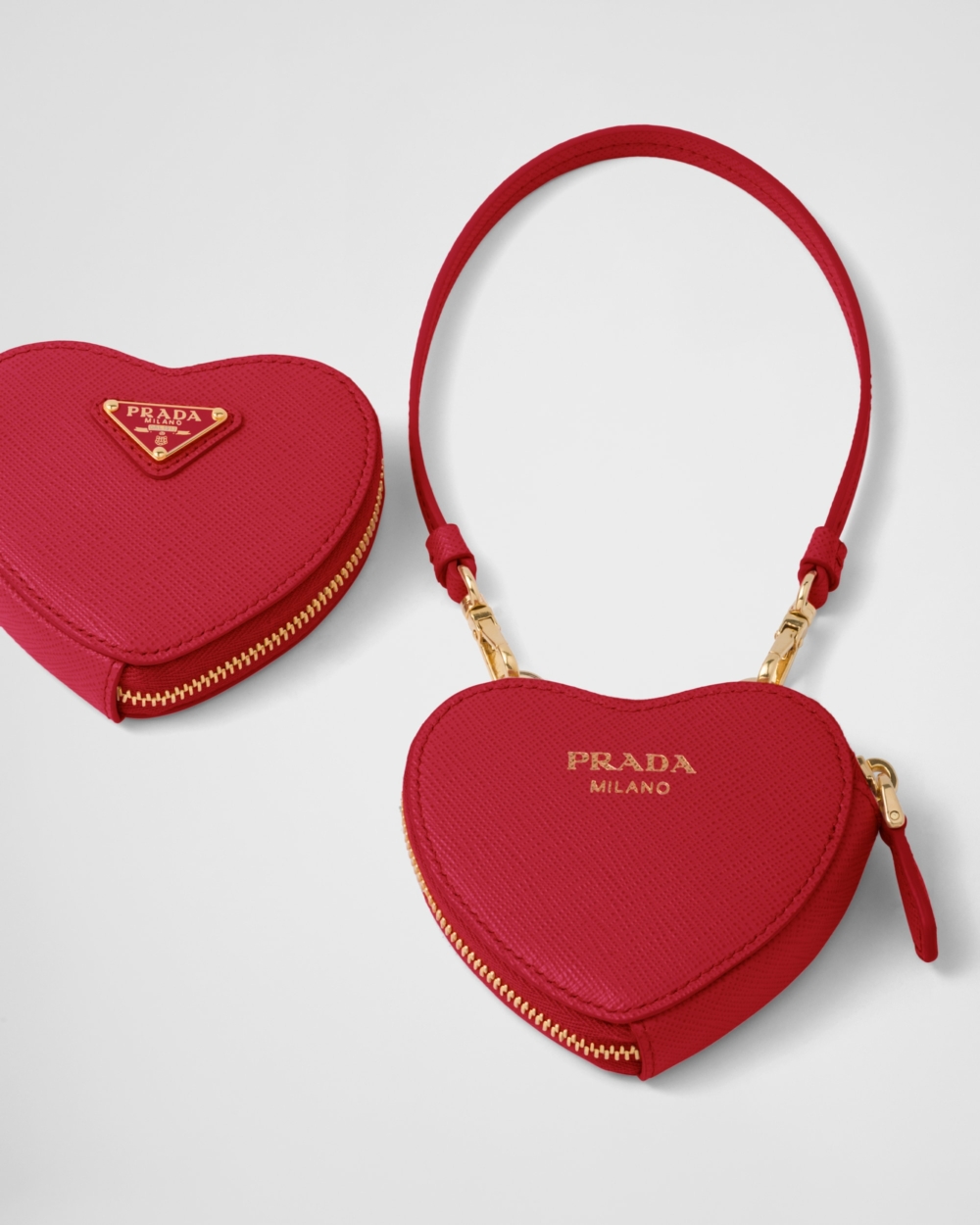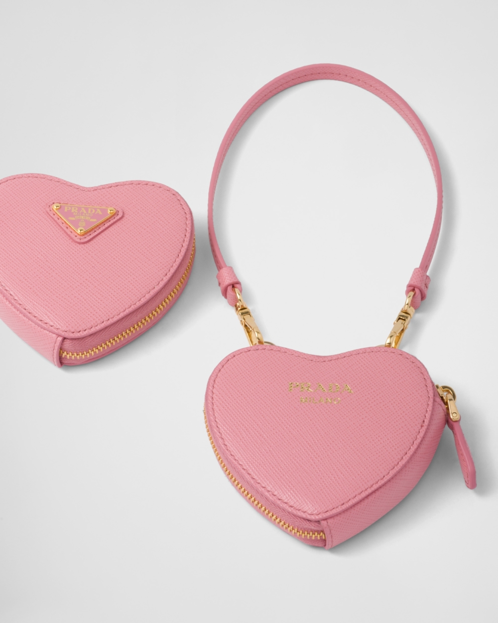同樣是愛心形狀的零錢袋,Prada Saffiano皮革迷你萬用袋配備可拆除的皮革肩帶,綴以搪瓷金屬三角形標誌,袋身上方帶有可拆式皮革手柄,並以拉鍊開合,雙層的收納空間可以存放許多小物,作為日常外出手袋也相當實用。HK$ 8,400