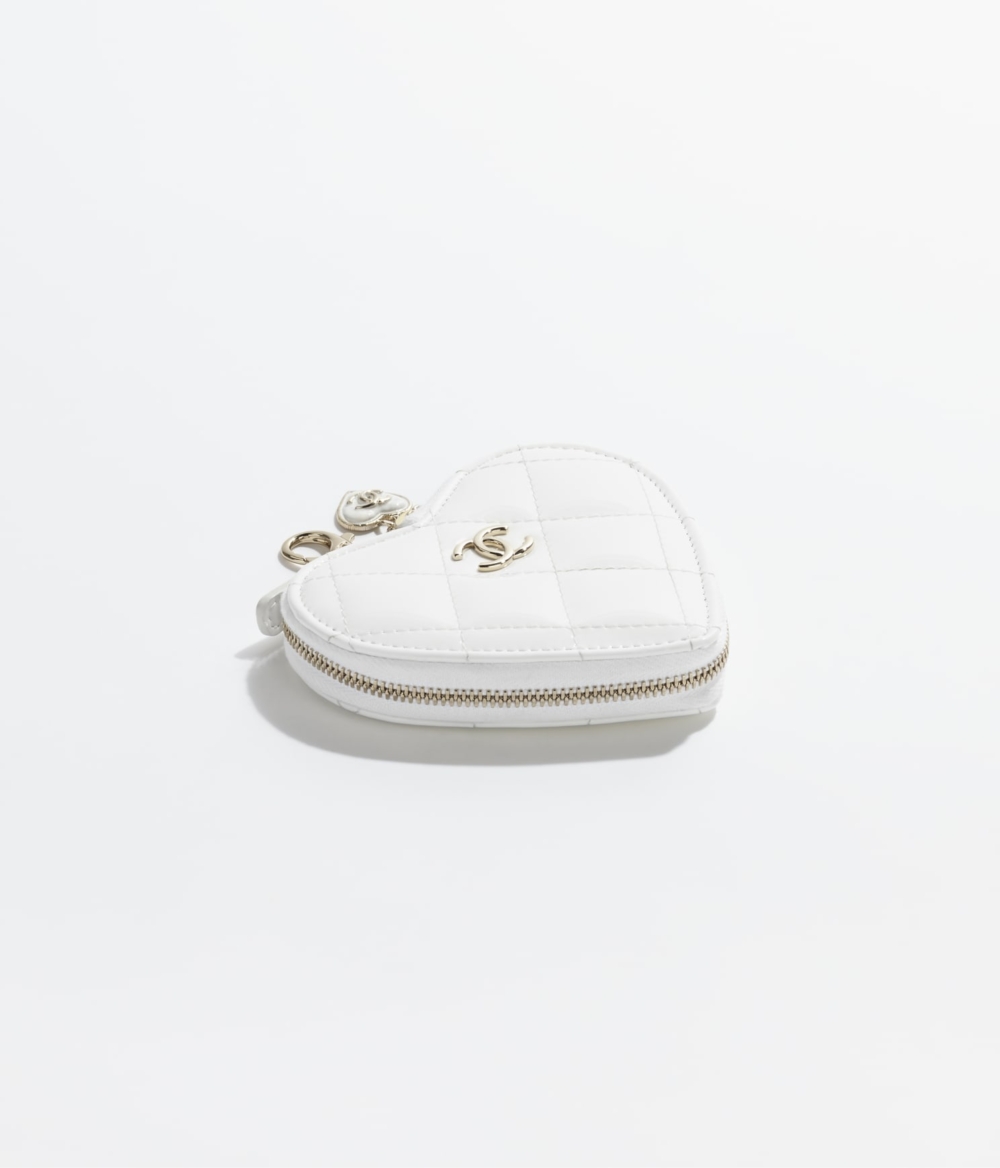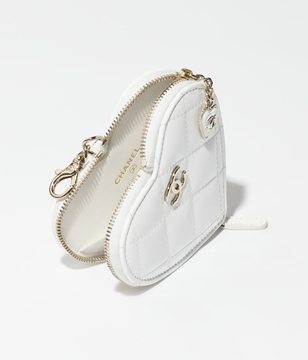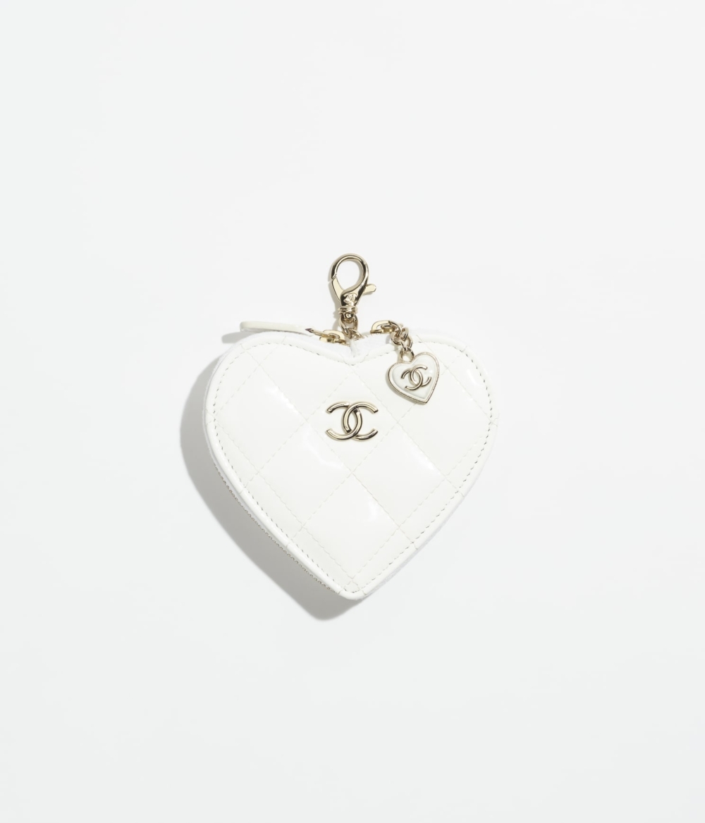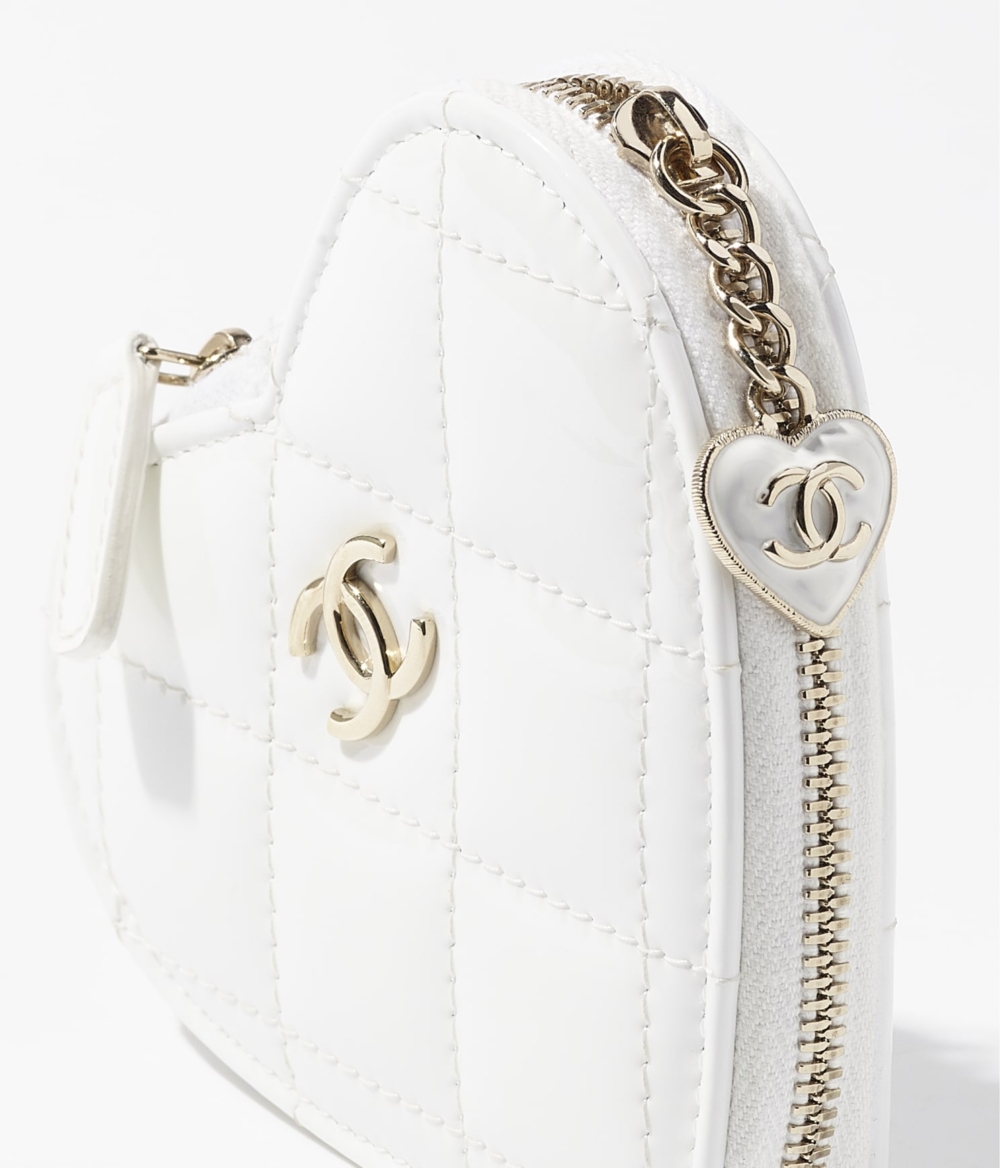 CHANEL的白色愛心零錢包採用漆皮小牛皮製成,外觀搭載品牌標誌性的菱格紋壓線,便在正面綴上品牌雙C Logo,尺寸為W10.5 × H11 × D1.7 cm,在拉鍊處懸掛了心型雙 C Logo吊墜,散發優雅氣息。HK$13,300