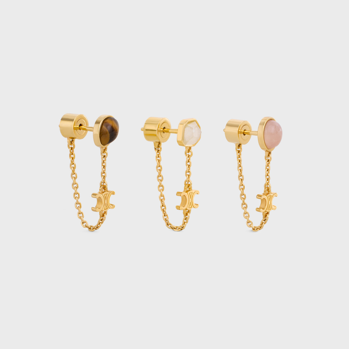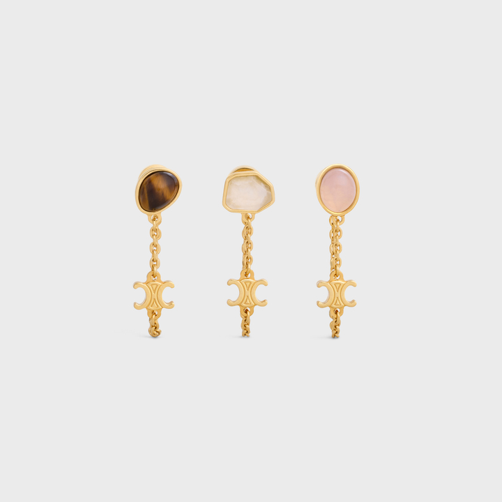 各式各樣的耳環款式,若鍾愛帶點復古精緻的風格,肯定不能少一款吊墜式設計,這款Triomphe Indie Set Of 3 Earrings以黃銅及髮晶及粉晶及虎眼石作為元素,搭配品牌標誌性金屬凱旋門,佩戴在耳垂下不經意展現撩撥人心的優雅感。HK$5,300