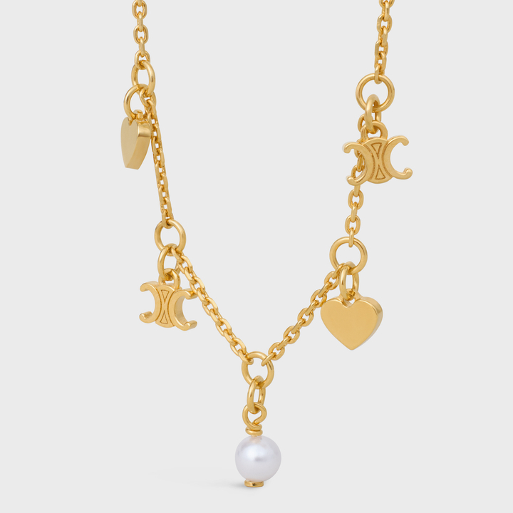 無論是想送上時尚暖心禮物,又或是犒賞自己,此款手鐲絕對是最佳選擇,凱旋門標誌與愛心成為吊飾,搭配黃銅及樹脂珍珠,鐫刻CELINE PARIS標誌,令人驚豔的精緻金屬質感。HK$4,950
