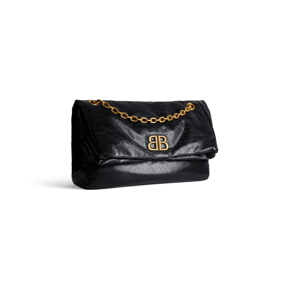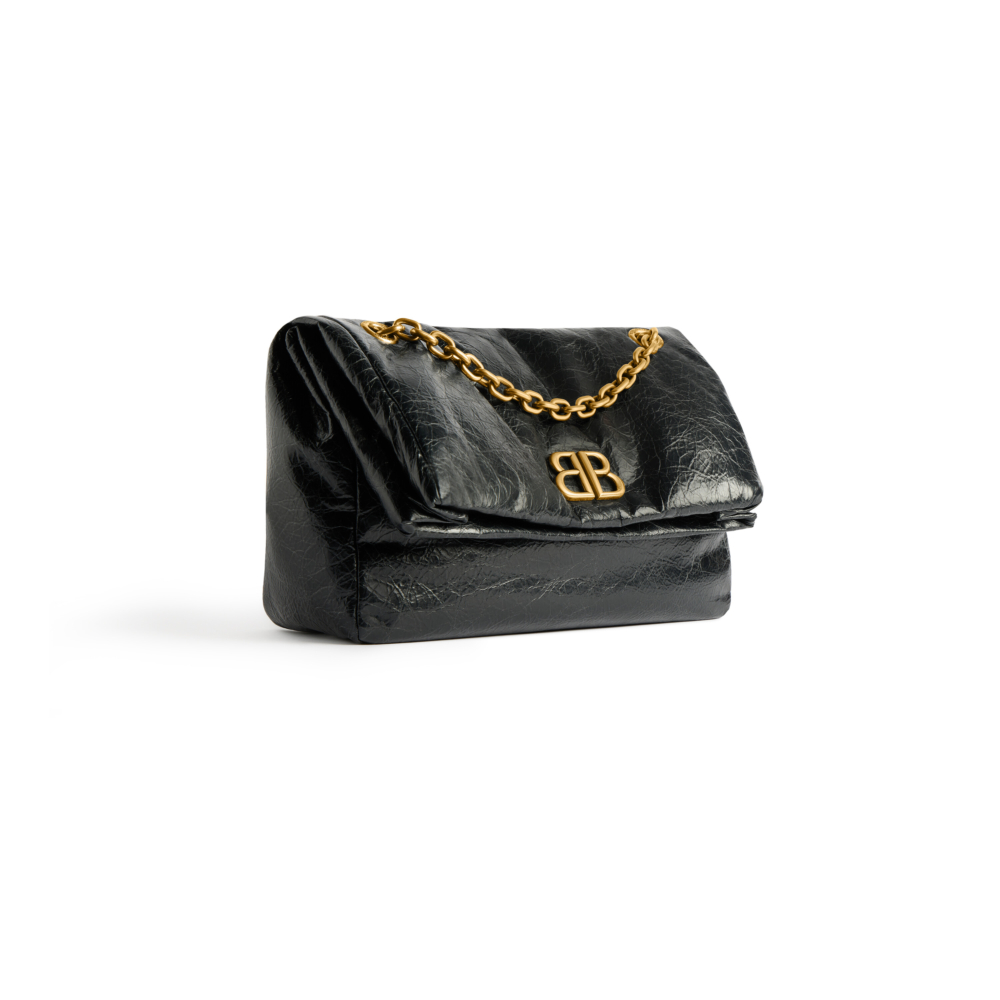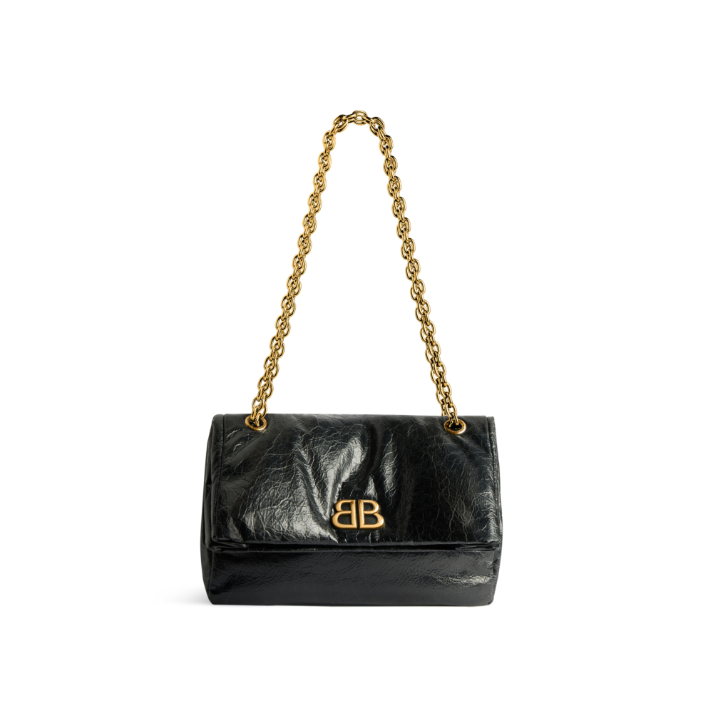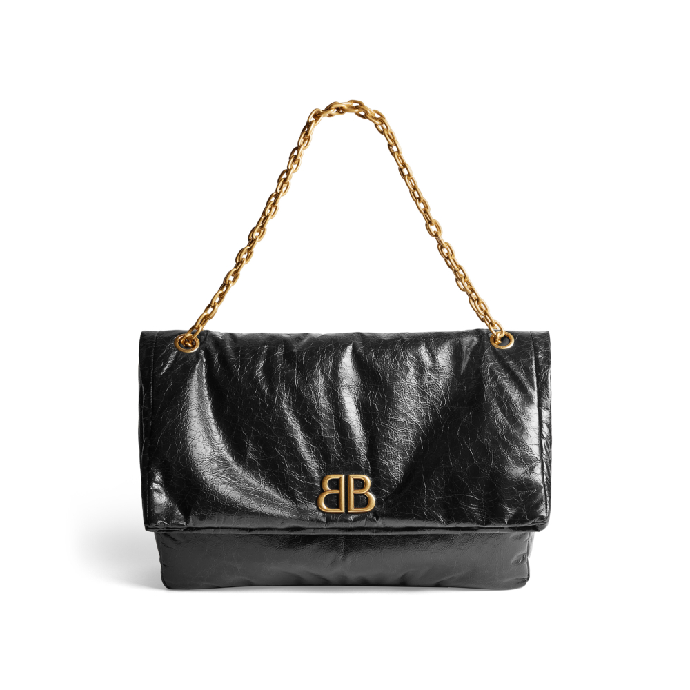 Monaco大號尺寸鏈條包,採用黑色Arena小牛皮製作而成,配有做舊的金色五金配件,擁有大容量卻打造不張揚的俐落輪廓,並且飾以經典圓邊黃銅BB Logo,Monaco包款沒有折疊時,是一款超大容量的口袋包,將手袋折疊後瞬間變身為郵差包,既可當作腋下包使用,也能把粗鏈條肩帶穿過邊角處的孔環斜挎,呈現與不同造型融合的搭配。HK$34,300