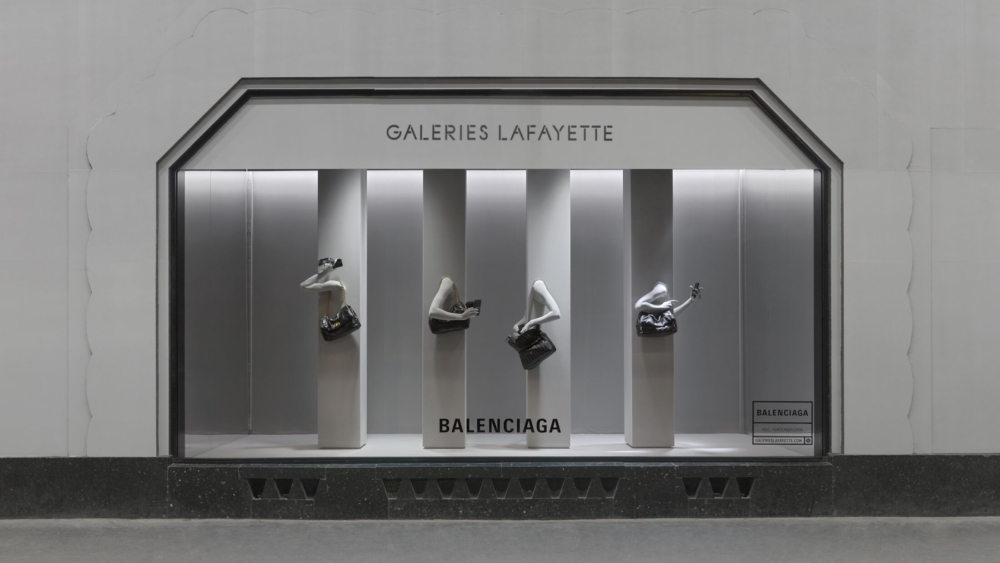 為了展示手袋的多元佩戴方式和充足的容量空間,牆面安裝上寫實主義的人體模型手臂,展現日常的生活展景。物品從包中取出的實際使用一系列的生活化行為,像是手拿太陽鏡、鑰匙和咖啡杯,舉起電話、拿出水瓶飲用、打開錢包或展開瑜珈墊,模型手臂和牆面均以Balenciaga專賣店陳列櫃相同的灰色人造絨面革。HK29,400