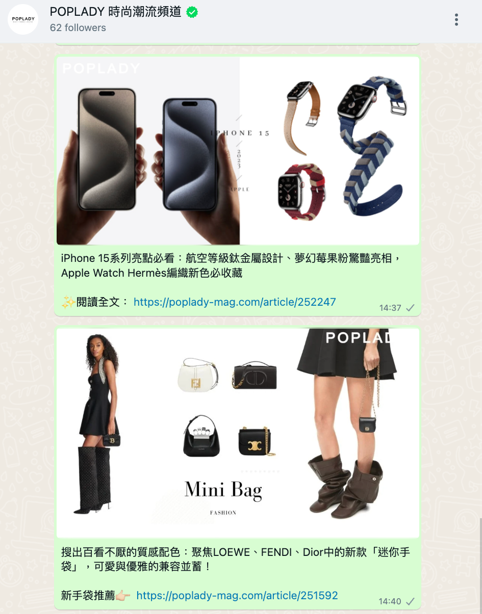 乘著WhatsApp Channels功能即將於香港上線,POPLADY也開啟全新WhatsApp Channels頻道,等不及想要獲取最新時裝、美妝、藝術、生活資訊,快立即加入「POPLADY WhatsApp Channels」更可快一步即時閱覽最新情報,一起探索美好事物,與時尚潮流愛好者為伍!