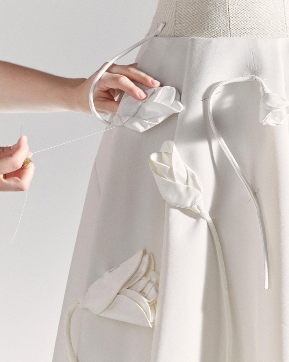 在Prada 2023 秋冬系列裡,前衛花卉雕塑躍上白色長裙、鞋履以及復古風格的手袋上,細膩的工藝讓造型充滿夢幻溫潤的質感,2023年秋冬系列與形象廣告的靈感來源,同樣以繁花為主角,呼應本季欲傳達的理念「Taking Care」,讓生活裡亦如含苞的花朵等待著綻放,超現實的隱喻花朵和人類之間的情感共振。
