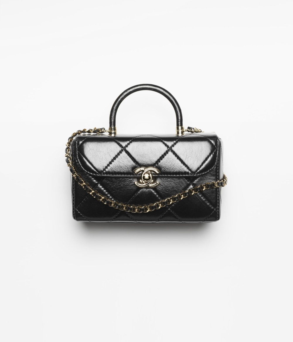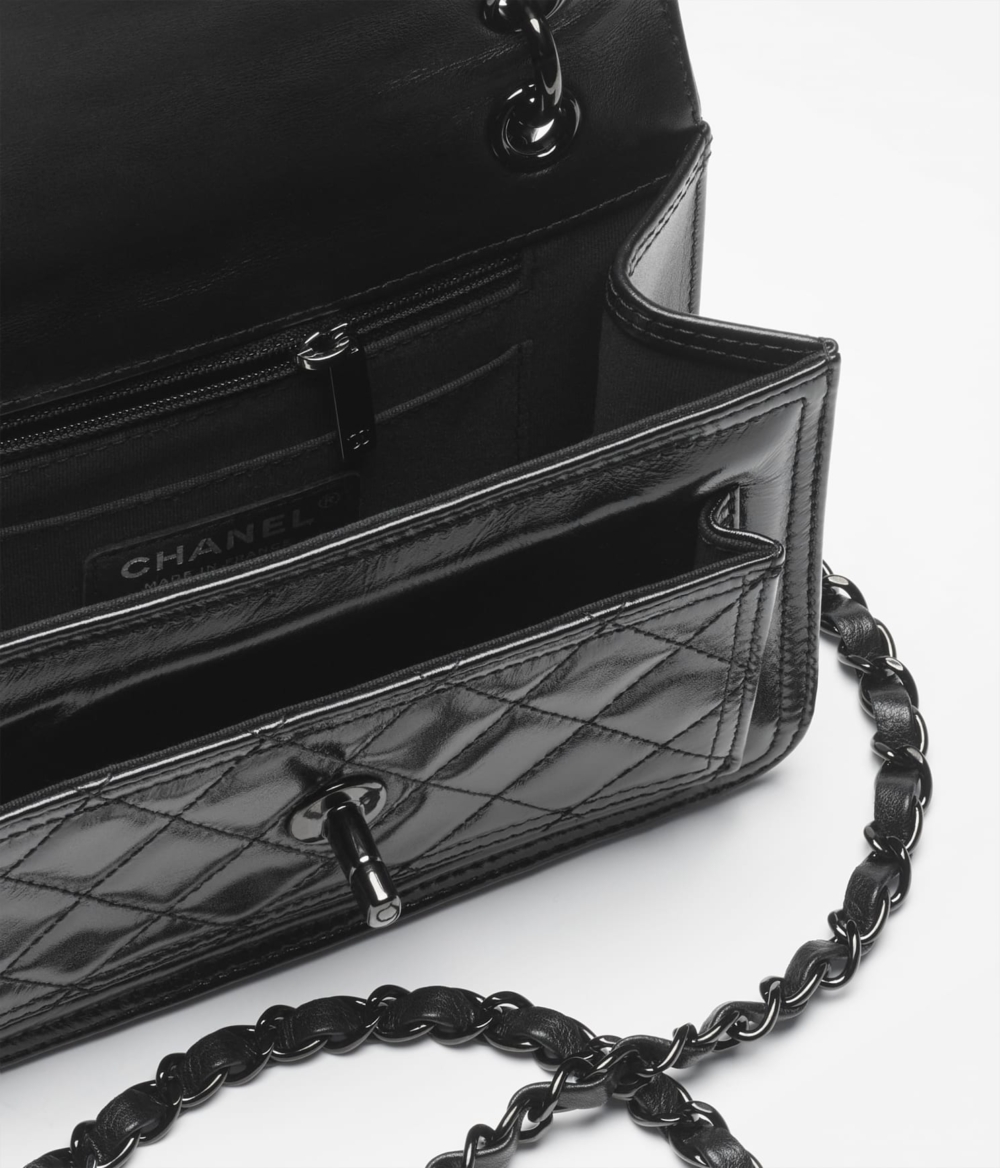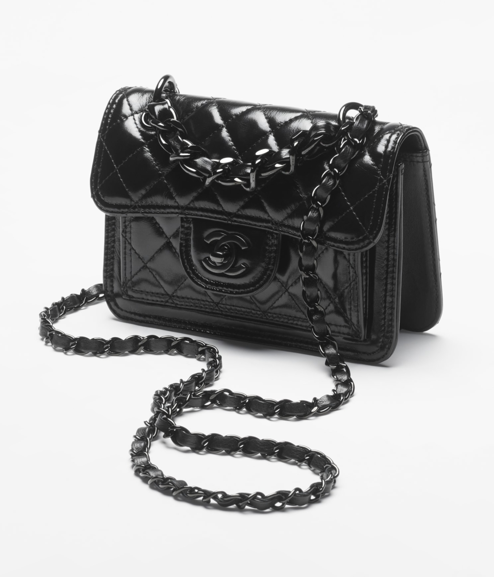 CHANEL秋冬全新推出的迷你翻蓋包, 保留經典的典雅輪廓,更是換上時髦的閃亮小牛皮搭配黑色金屬,如此令人一見鍾情的存在,就是品牌的經典精髓。全黑色調打造而成,並附有相同色系的鏈條交織皮革揹帶,簡約造型揹上就能體現時尚焦點。HK$44,300