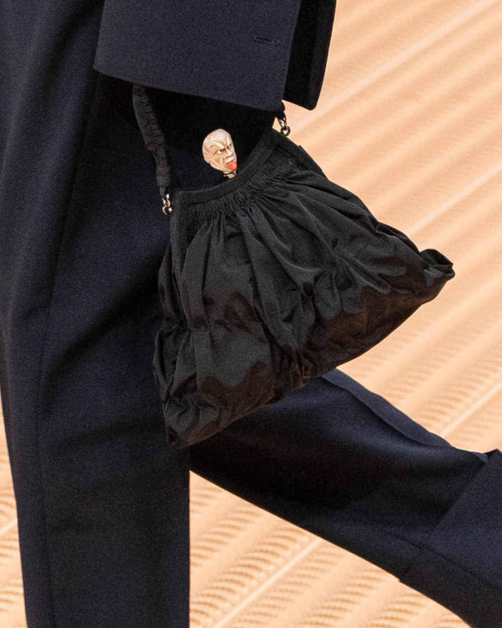 身為旅行家的Mario Prada有著濃厚的求知慾和對文化的興趣,於全球各地尋找珍貴獨特的物品、材料與工匠,以豐富日常生活。 回到米蘭後,交由工匠將這些物品組裝成複合件,這些由珍貴皮革製成的化妝盒、家用手錶、日曆、瓷器、優雅小包等,他將其命名為「oggetti di lusso」,即奢侈品。秀場上這款帶有扣飾的晚宴包,開口處以手工雕刻扣飾描繪了一個神話人物,帶出東方藝術美學的意涵。新手袋一改過去的波紋絲綢設計,以納帕皮革與再生尼龍重新演繹。同時Prada也將標誌性的人頭扣飾細節運用到皮革或尼龍材質的超大手提包款式中,延續品牌精湛工藝。