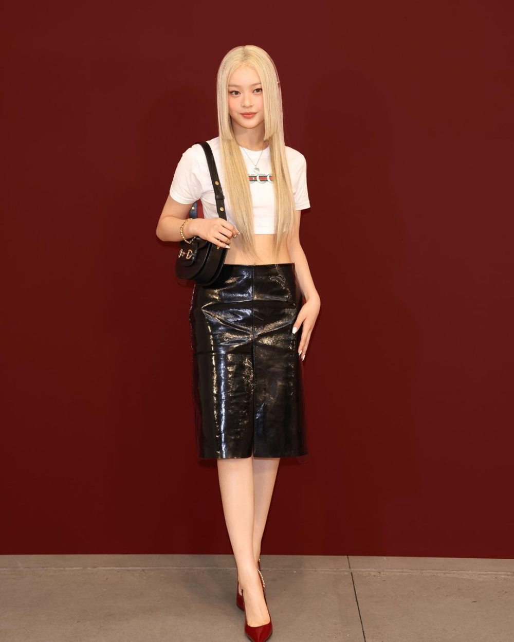 這回受邀參加Gucci米蘭時裝週,Hanni換上一頭公主切金髮,搭配黑色亮面半身裙以及紅色跟鞋化身美式辣妹,看起來明亮又有精神,活潑可愛。