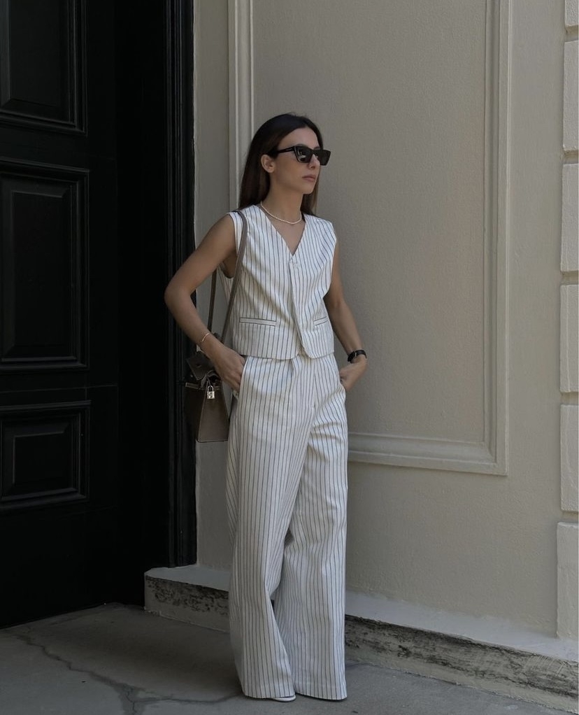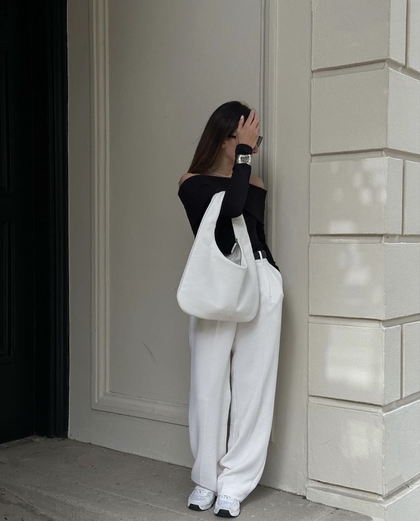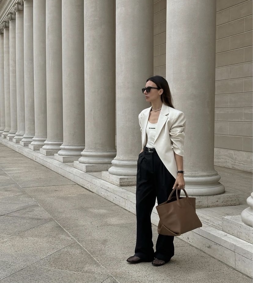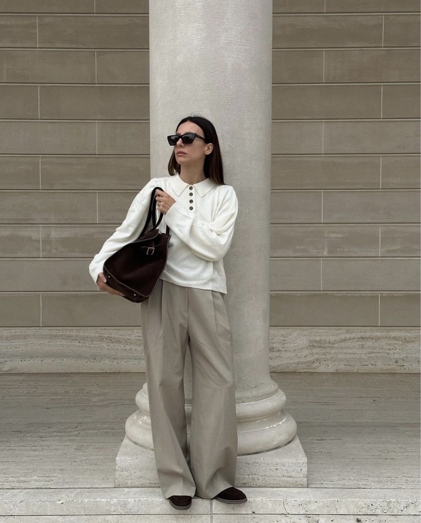 從簡約剪裁設計到精緻觸感,淺色系的單品搭配總是百穿不厭的組合,Şirin Haban利用清新精緻的淺色褲子作為主要視覺重點,無倫是搭白色T-shirt、背心又或是平口的上衣都顯現輕鬆自在的高級氣質。步入秋天,偶爾的天氣涼爽再加個西裝外套也能呈現出不同感覺。