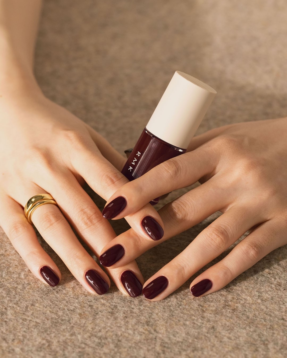 增添一些醇厚感的酒紅色指彩更能襯托出手的膚色,同時也為穿搭帶來一股辛辣的誘惑感,如果你想要降低這樣的氛圍,不妨穿插在跳色美甲中,搭配米色、淺色調指彩,低調呈現優雅氣質。
