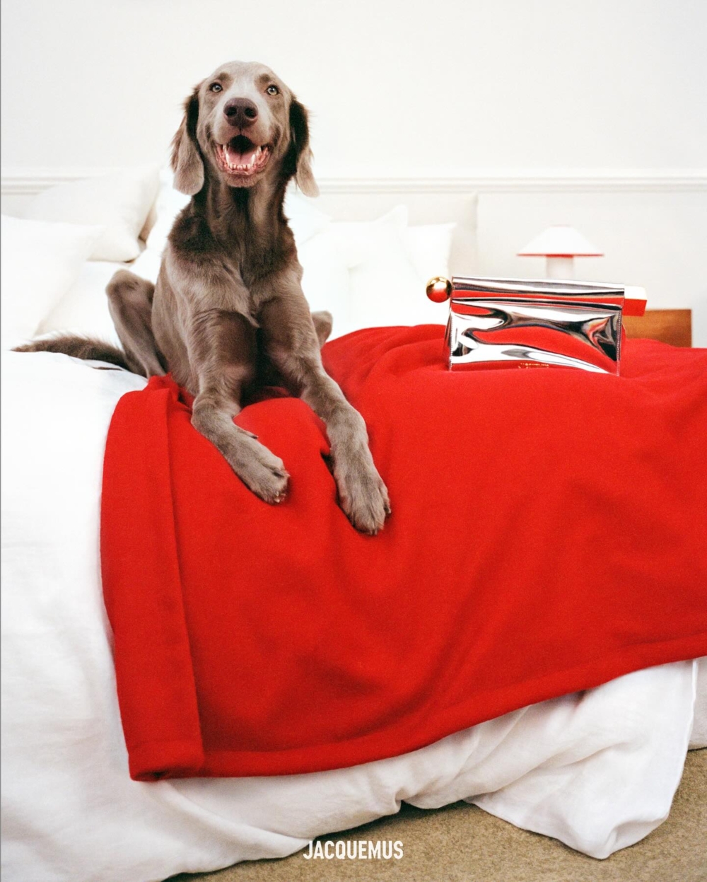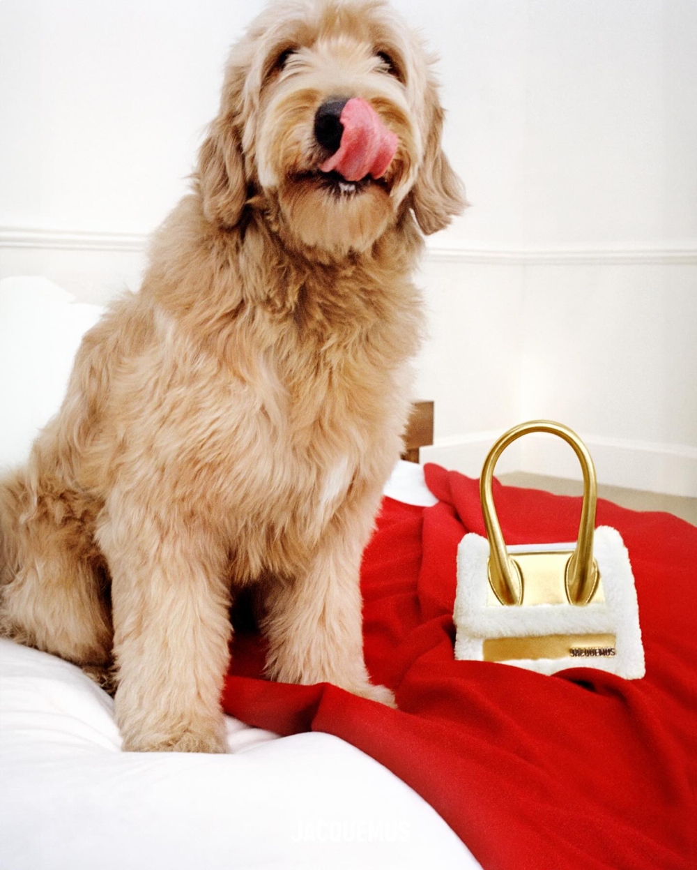 狗狗也與Jacquemus手袋出鏡形象廣告,金色外觀的Le Chiquito moyen doux是品牌的經典手袋,釋出呼應聖誕節的金色還有銀色款,在邊緣裝飾柔軟的絨毛,小巧的尺寸裝進滿滿的可愛與時髦感!銀色鏡面的Jacquemus「Take-out clutch」 外形神似外帶盒,馬上成為大家目光鎖定的焦點。價格為$965(約HK$HK$7,561)