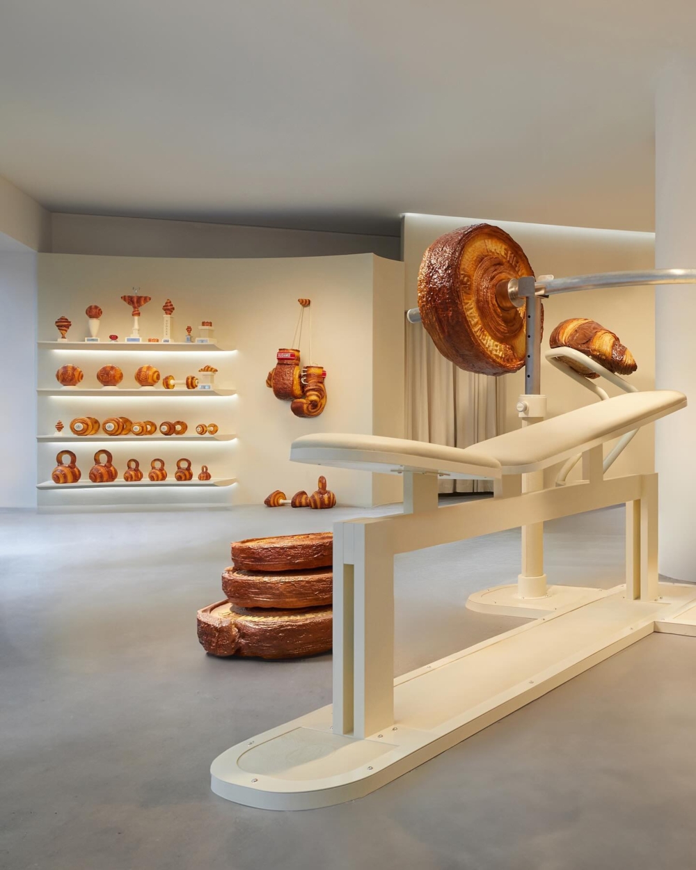 走進店內則陳列著各種運動器材結合各種大大小小的麵包,蓬鬆柔軟的巨大牛角麵包被放安置在跑步機上,可頌更化身巨大的運動器材、健身啞鈴、拳套、獎盃排列在純白的展架,好比欣賞展品一般十分有趣。