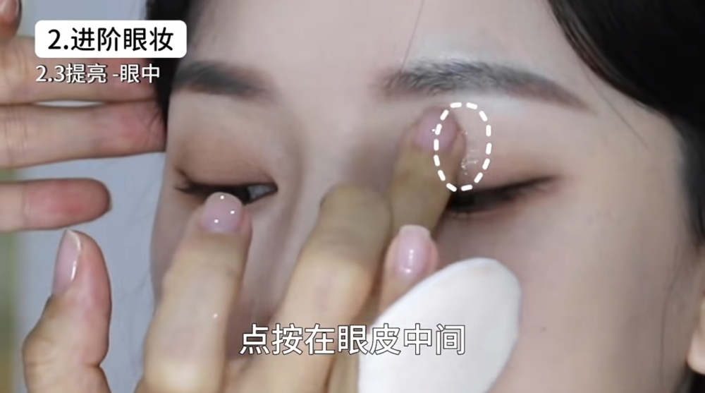 -最後,用手指將閃亮眼影點綴在上眼皮中間位置,再用乾淨手指暈開,識雙眼在睜開有少許閃閃效果,即可。