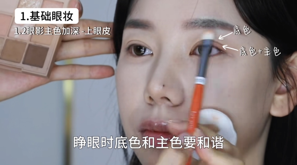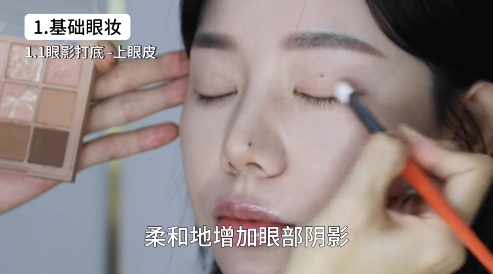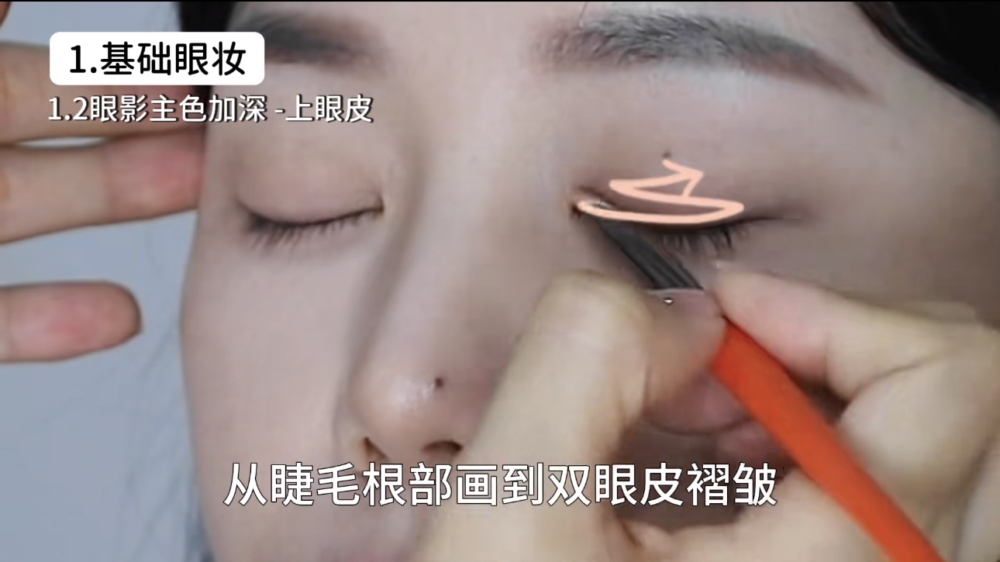 -先在上眼皮位置用杏色眼影打底,柔和地加深眼部陰影;