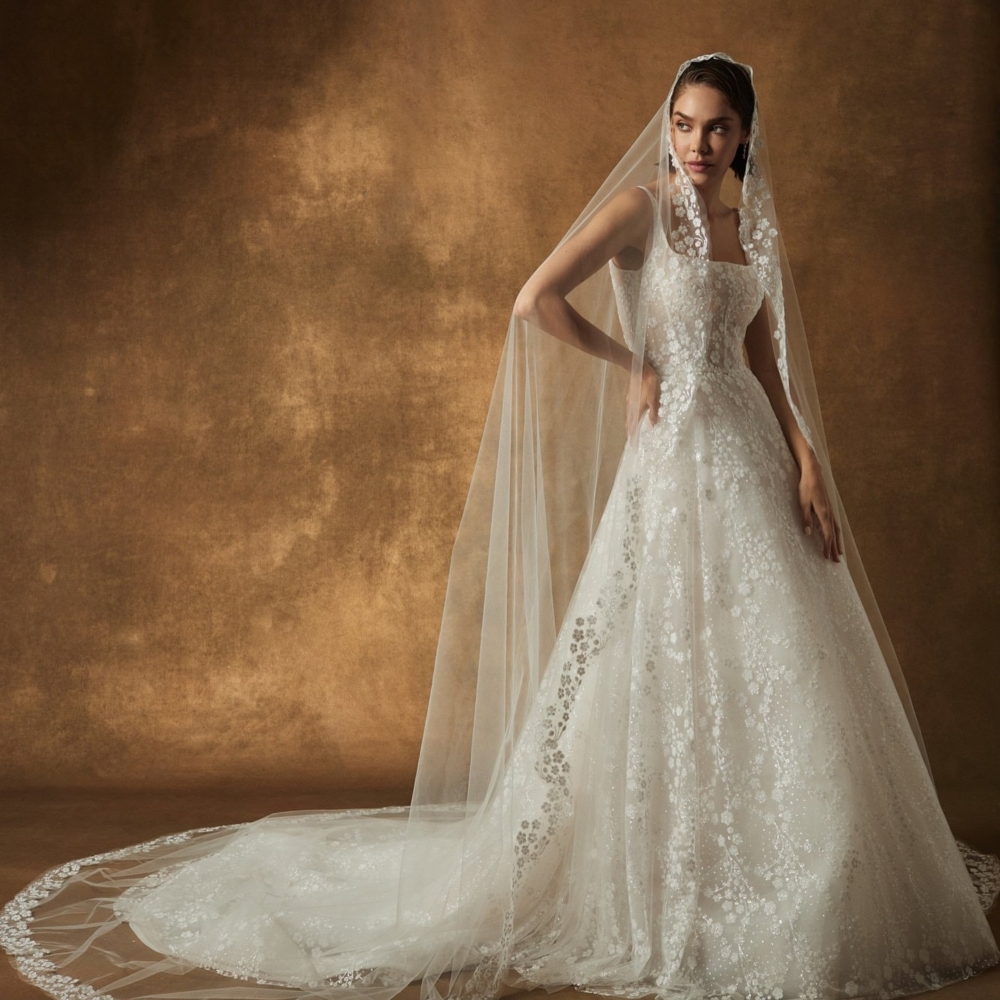 「Celestial」是一款新月形無肩帶禮服,採用天體淋浴式閃光薄紗製成,配有輪廓拼接衣身和側面開衩的褶皺全 A 字裙。這件禮服配有可拆卸的寬肩袖口和水晶紐帶。