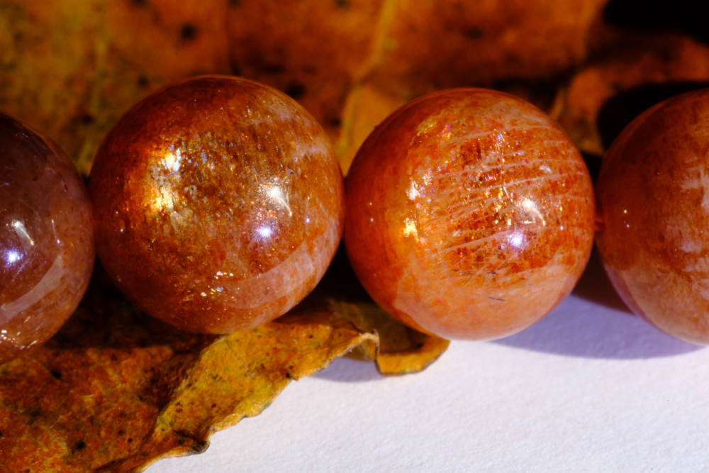 金太陽石屬於長石家族,學名為日長石(Sunstone),最引人注目的特徵是內部閃爍的金屬光澤,稱為「砂金效應」。這種效應在光線折射下呈現出金紅、橘金或琥珀色的動態閃光,彷彿太陽的光芒被封存於石頭之中。這也使金太陽石成為水晶愛好者的心頭好。