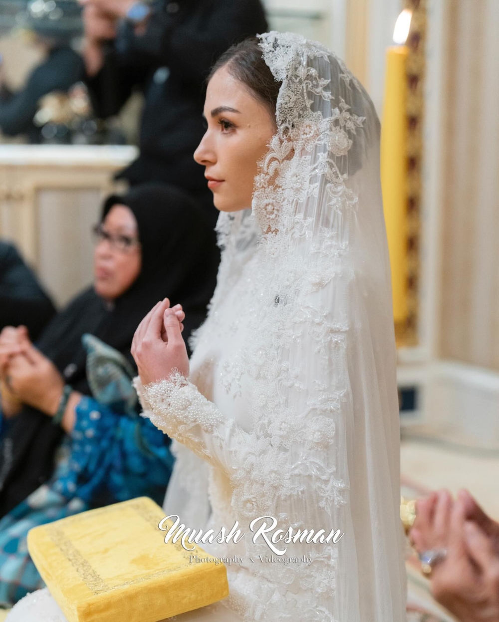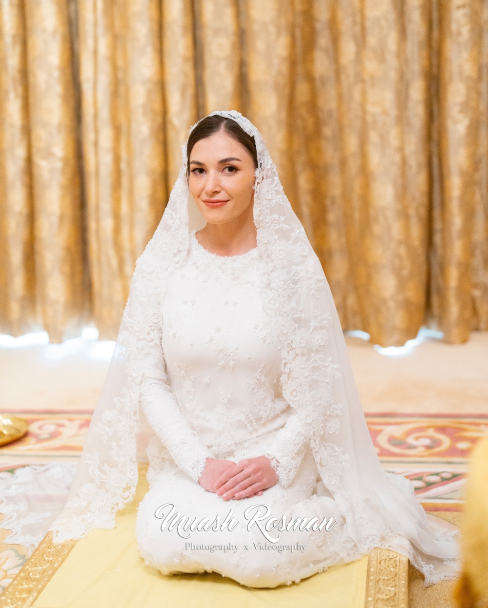 正式皇家婚禮當天,地點選在在蘇丹官邸努魯伊曼皇宮的皇家王座大廳舉行,新娘延續穆斯林婚紗的傳統穿上長袖白色傳統禮服,她手捧一束鑲有寶石的銀製小花束,搭配鑽石耳環和看起來相當有分量的鑽石項鍊,穿著鑲有珠寶、戴著王冠的白色長裙,看起來美得令人難以忘懷!